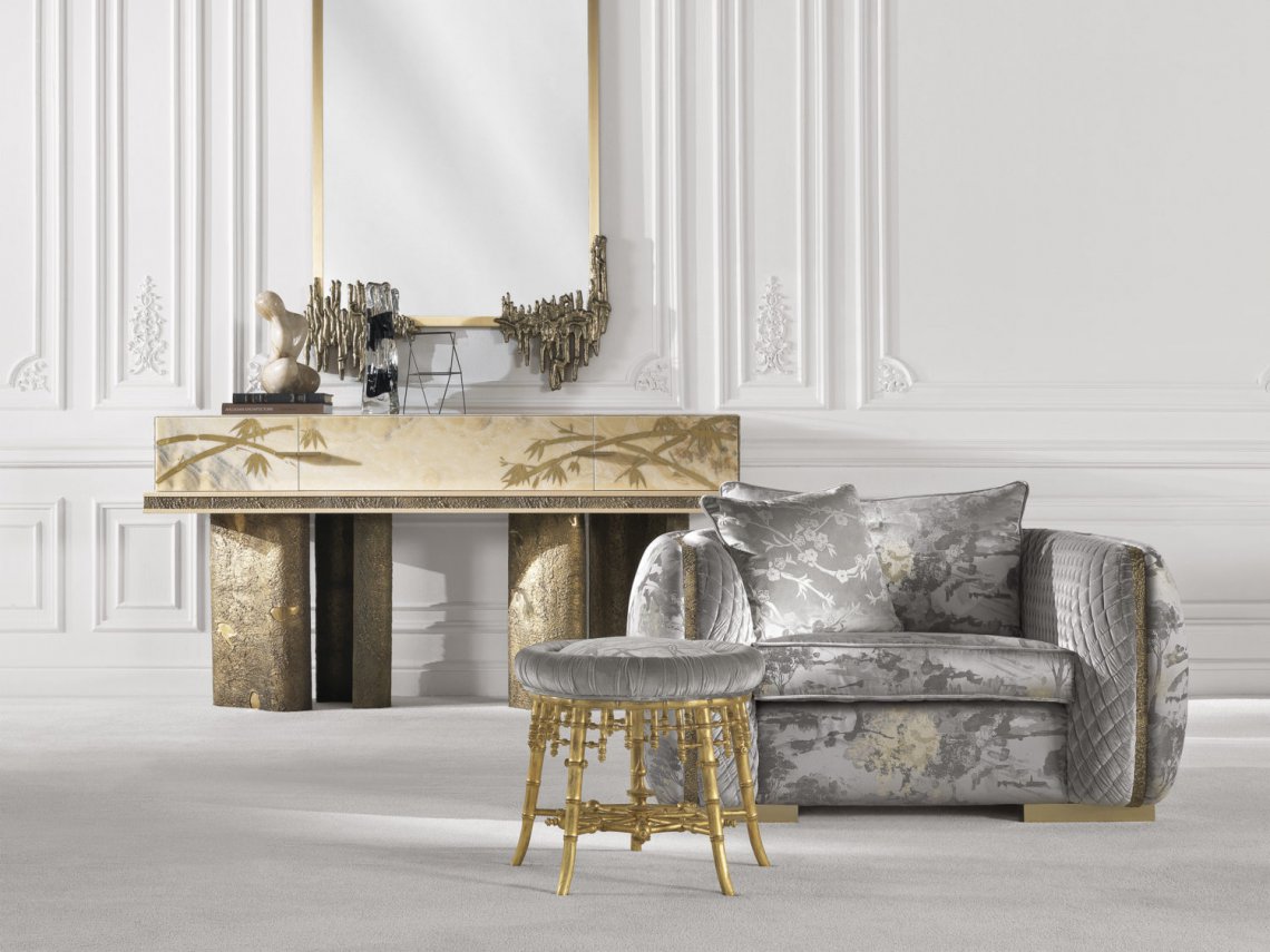 CONSOLE WITH SCULPTURAL BASES IN LOST-WAX CAST BRASS WITH ANTIQUE BRONZE FINISHING. STRUCTURE IN MAPLE, COVERED IN CLOUDY ONYX WITH GOLD LEAF DECORATIONS. INSERTS IN CAST BRASS.