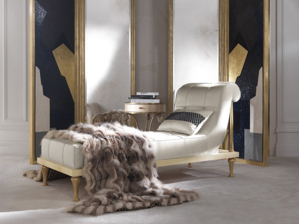 CHAISE LONGUE WITH STRUCTURE IN MAPLE. PADDING IN FOAM. UPHOLSTERY IN FABRIC. DETAILS WITH GOLD FINISHING.