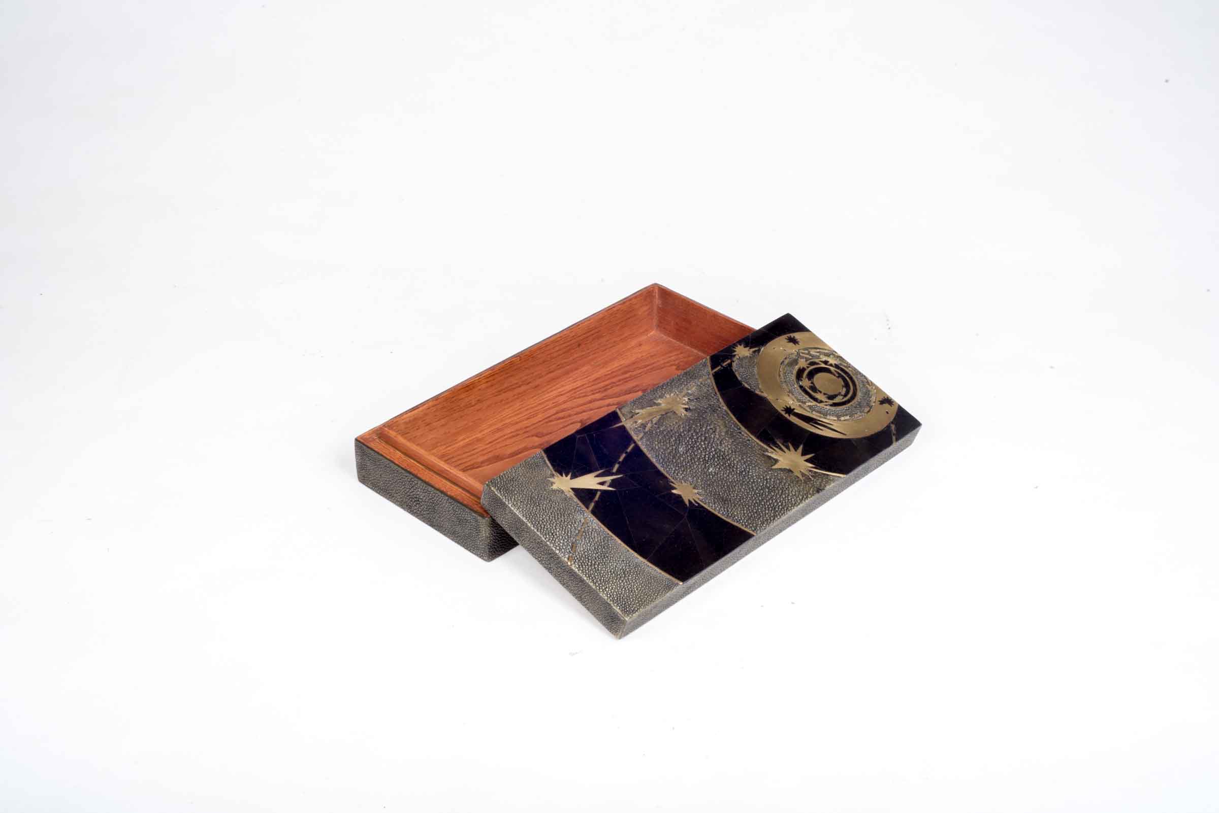 The Constellation Dark Rectangle Box showcases the signature whimsical details of KIFU PARIS. This piece includes intricate inlay work of shagreen, pen shell & bronze patina brass to create this stunning pattern. Available in other sizes and different finishes.