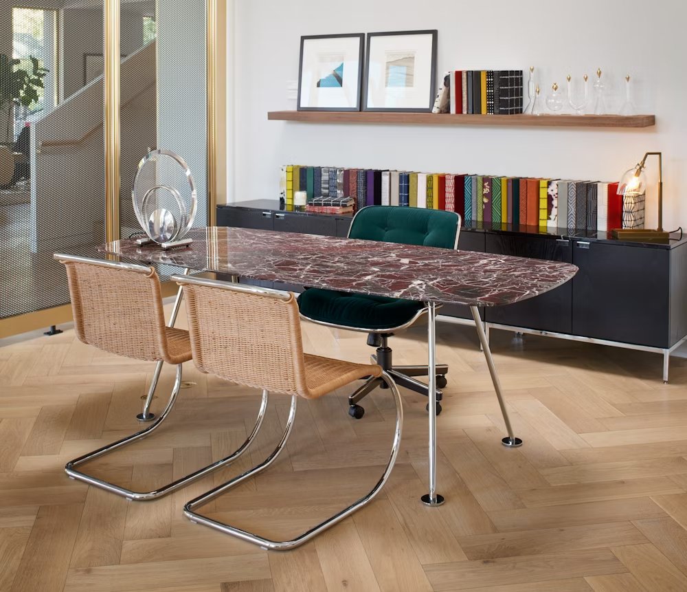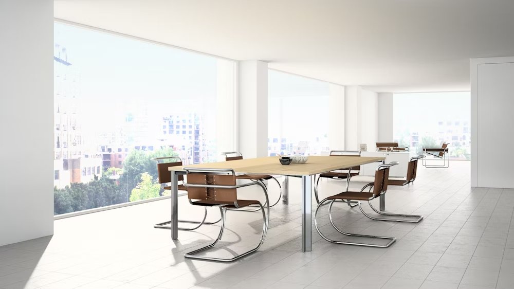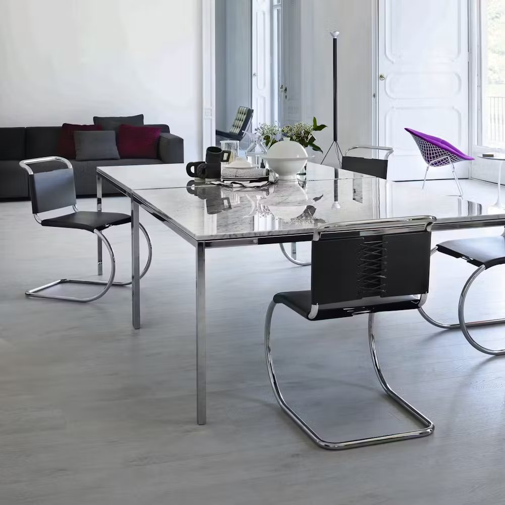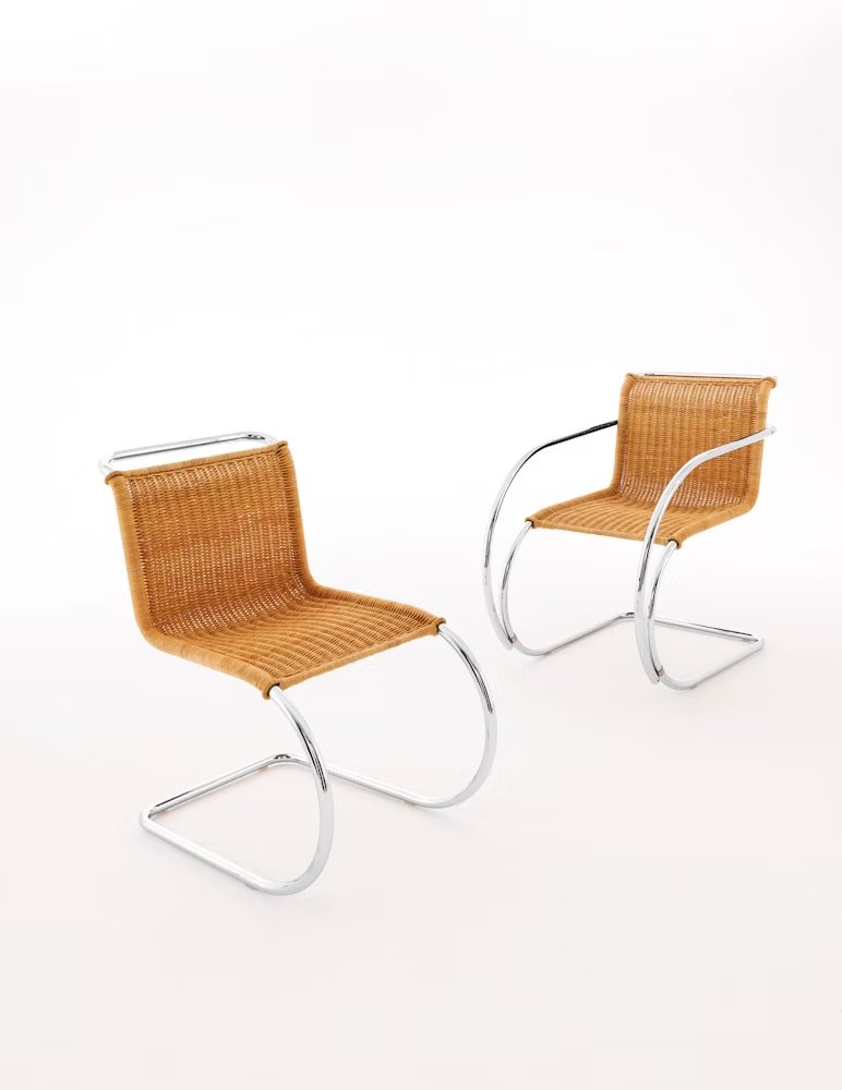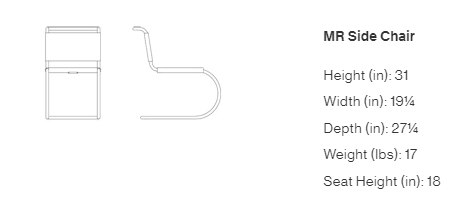 Influenced by fellow Bauhaus master Marcel Breuer, Ludwig Mies van der Rohe quickly recognized the merits of tubular steel. Pairing the modern material with the classic form of nineteenth-century iron rocking chairs, he created the MR Chair in 1927. With its graceful curves and cantilevered structure, the chair takes a striking form that flexes to comfortably support the movements of the sitter. In 1948, Mies granted Knoll exclusive rights to produce his furniture, including the MR Series.