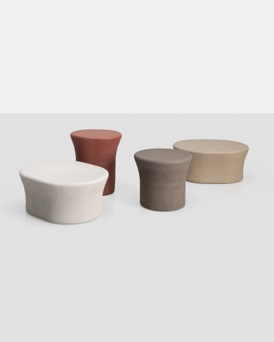Indoor/outdoor low tables with an open and functional shape that explore the various proportions of fungal species when grouped together. Positioned side by side, they create fluid compositions where each element, despite having different dimensions, integrates perfectly with the others.