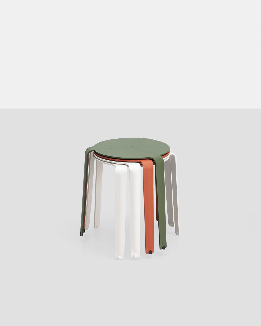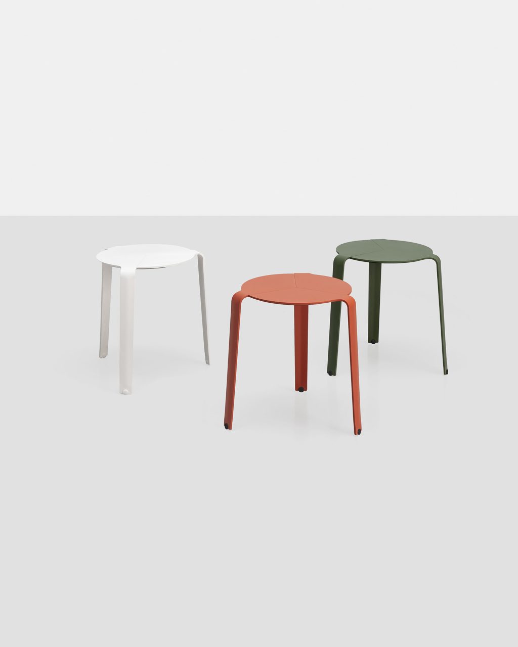 Tribute to Alvar Aalto. Reissue of the three-legged table/stool designed by Luciano Bertoncini in 2012, made entirely of aluminium and stackable up to 10 pieces. Suitable for outdoor and indoor environments.