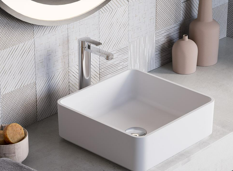 Countertop squared washbasin in matt colored Mineralmarmo or in matt white Solid Surface, with possibility of external Colour finish, glossy or matt.