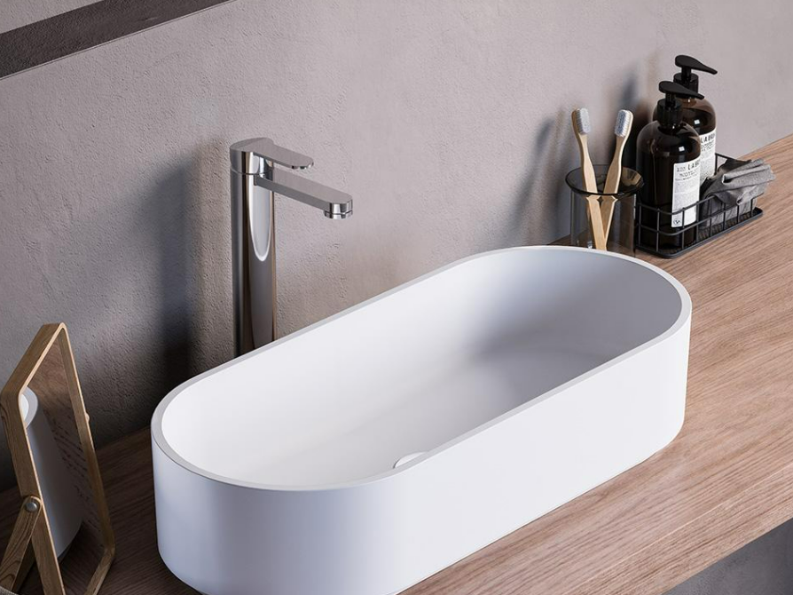 Countertop oval washbasin in matt colored Mineralmarmo or in matt white Solid Surface, with possibility of external Colour finish, glossy or matt.