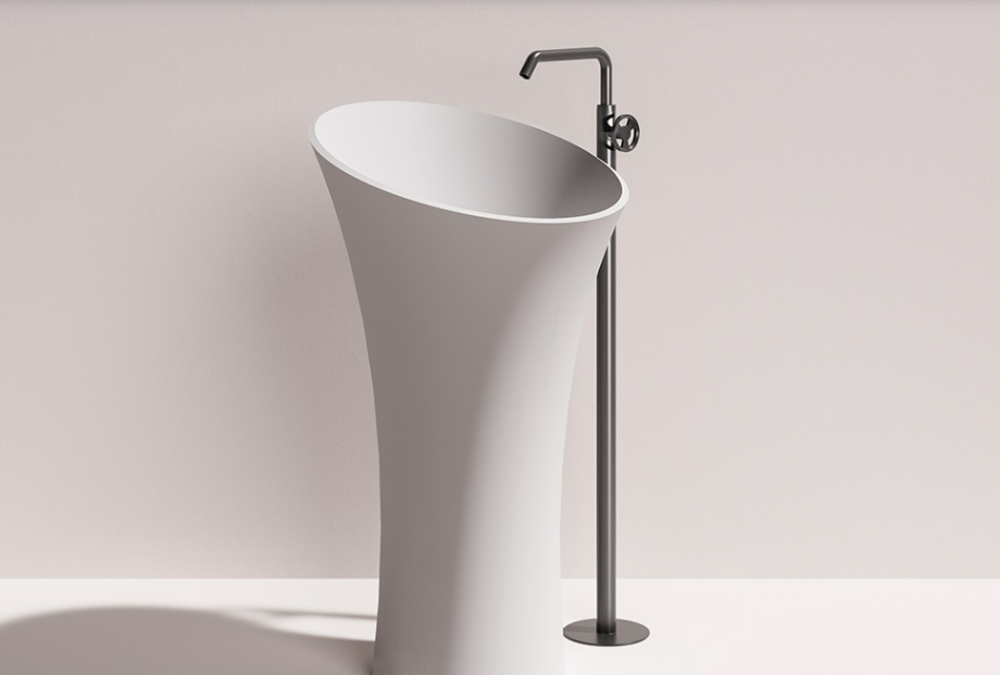 Freestanding washbasin in matt white Solid Surface, with possibility of external Colour finish, glossy or matt.