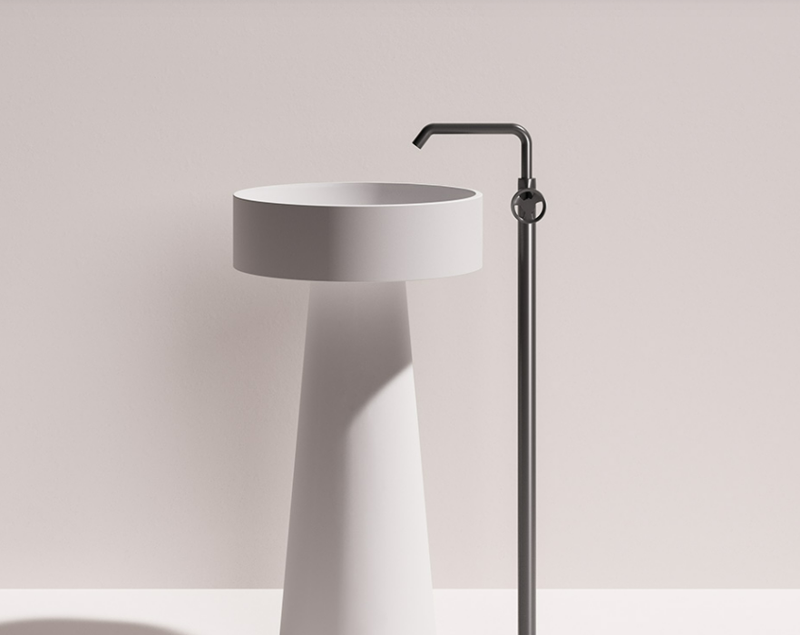 Freestanding washbasin in matt white Solid Surface, with possibility of external Colour finish, glossy or matt.