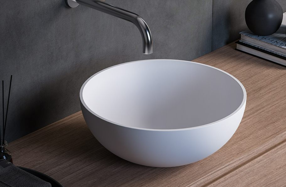 Countertop round washbasin in matt white Solid Surface, with possibility of external Colour finish, glossy or matt.