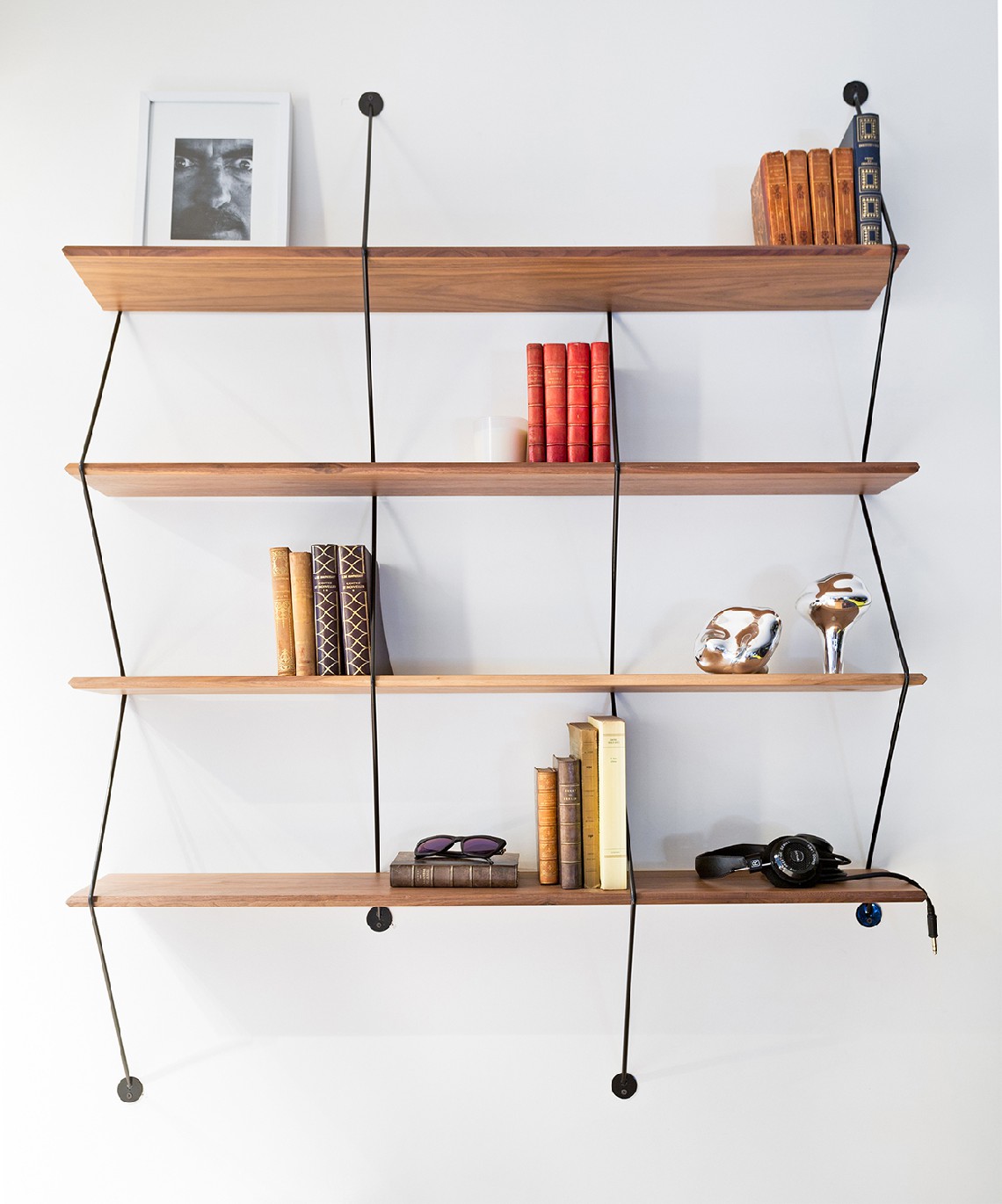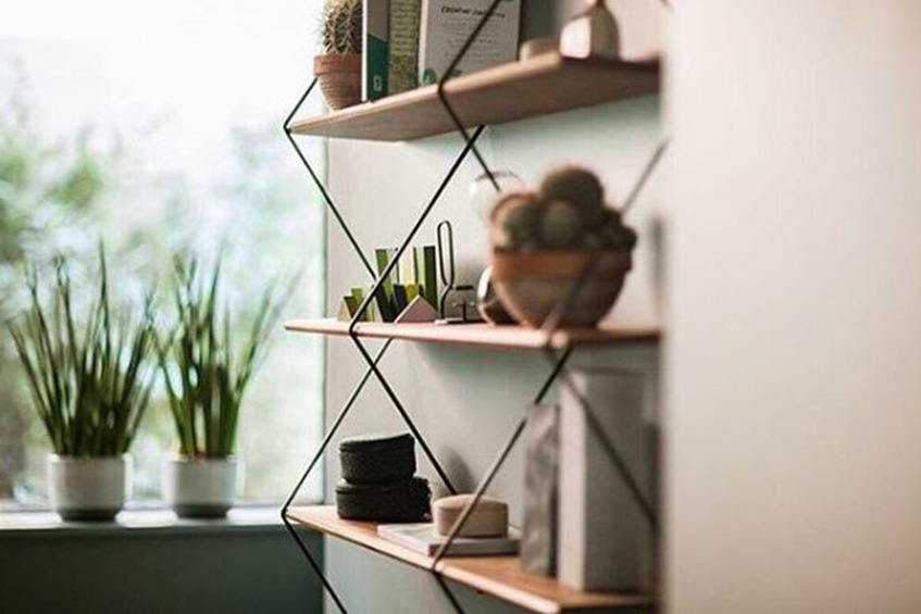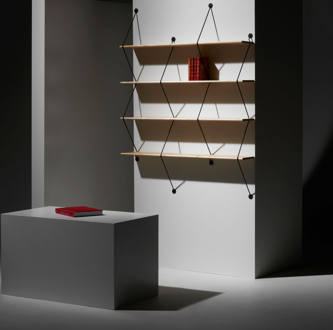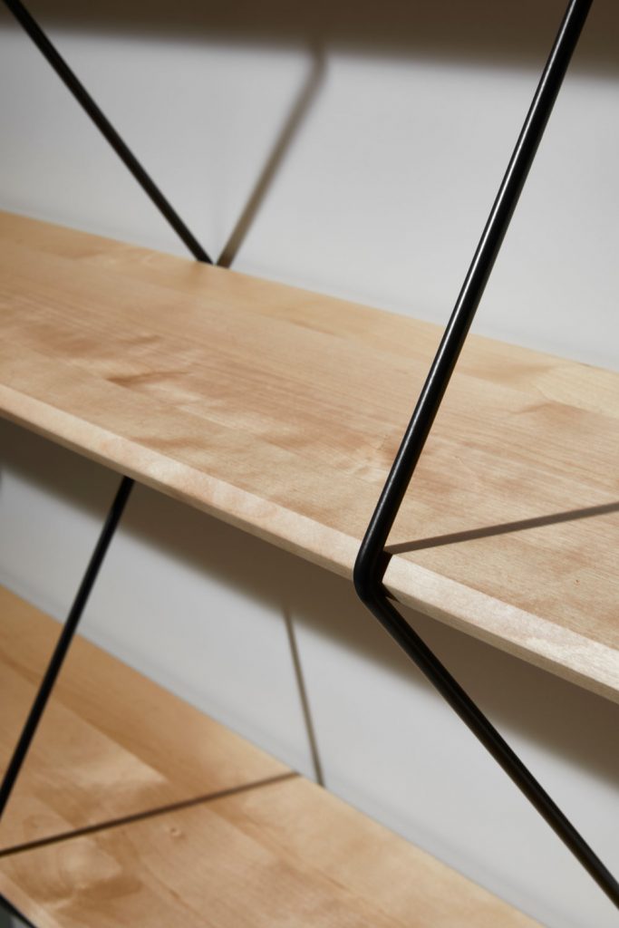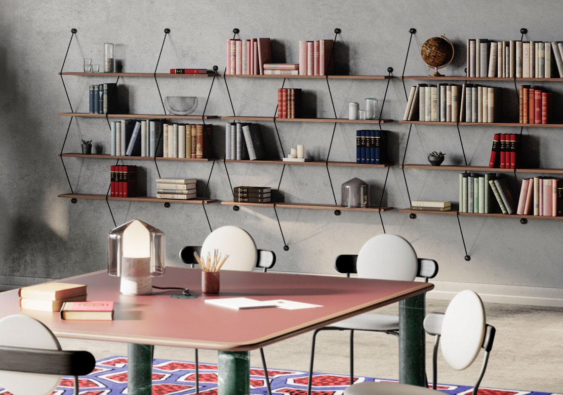Climb is an ingenious shelving system made of beveled wooden boards supported by metal wires.