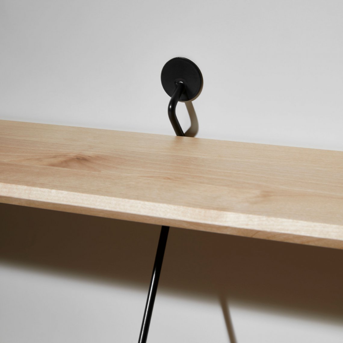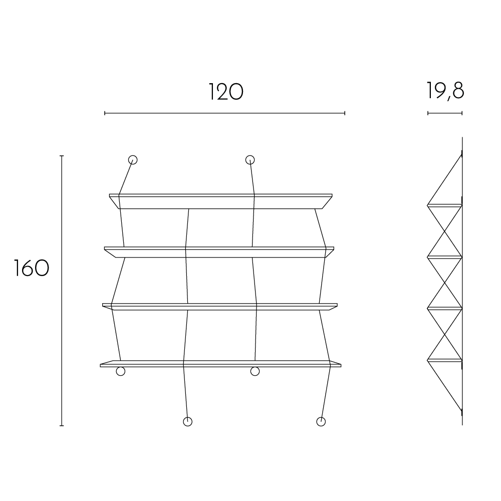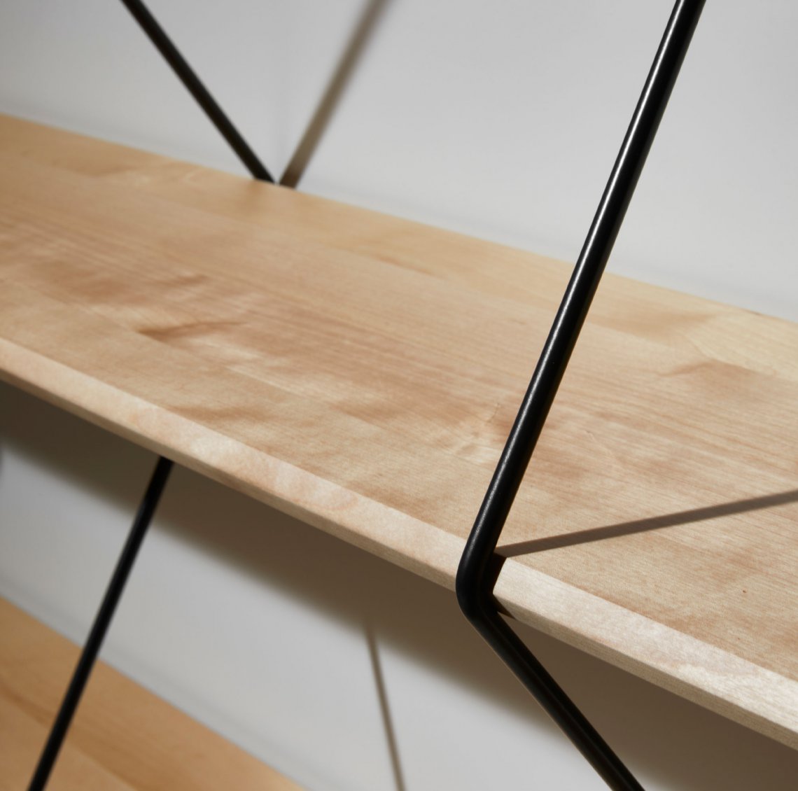 Climb is an ingenious shelving system made of beveled wooden boards supported by metal wires.