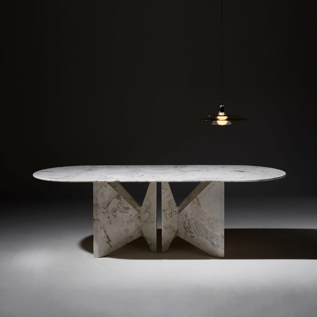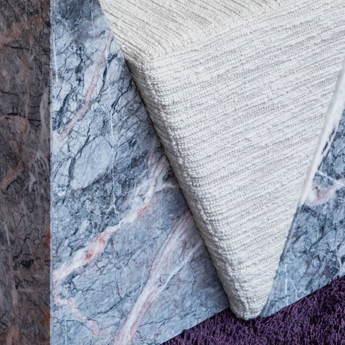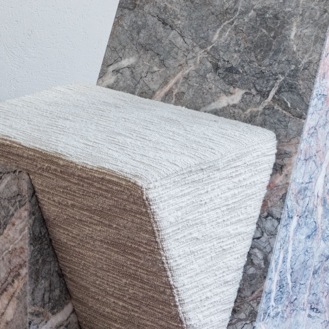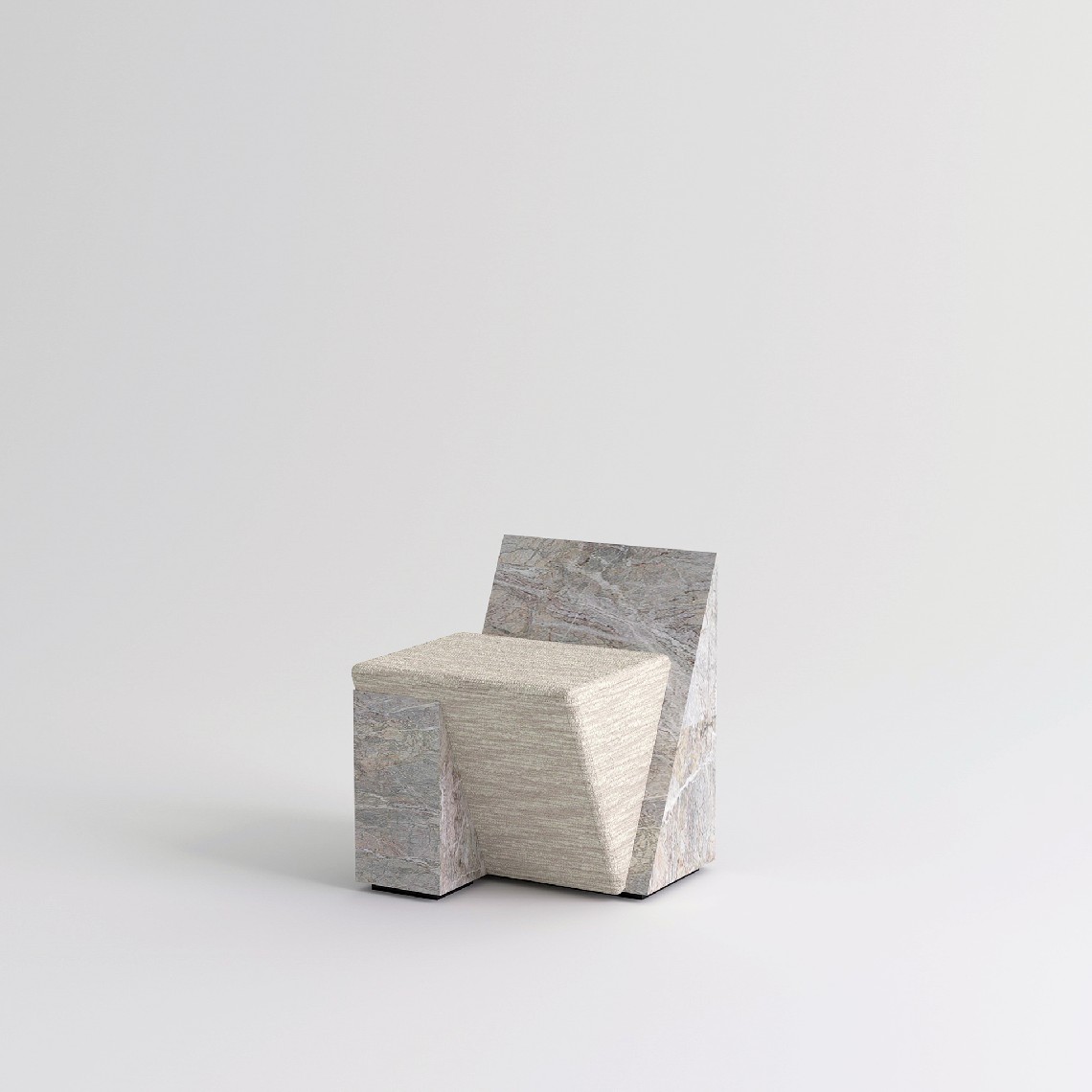 MARMINI II is despite its minimalistic architectural appearance a comfortable upholstered stool. It is composed of three volumes that apparently do not seem to be able to stay together, two hard parts in ‘Fior di Pesco’ marble that seem to want to detach themselves from the central part of the upholstered soft padding.