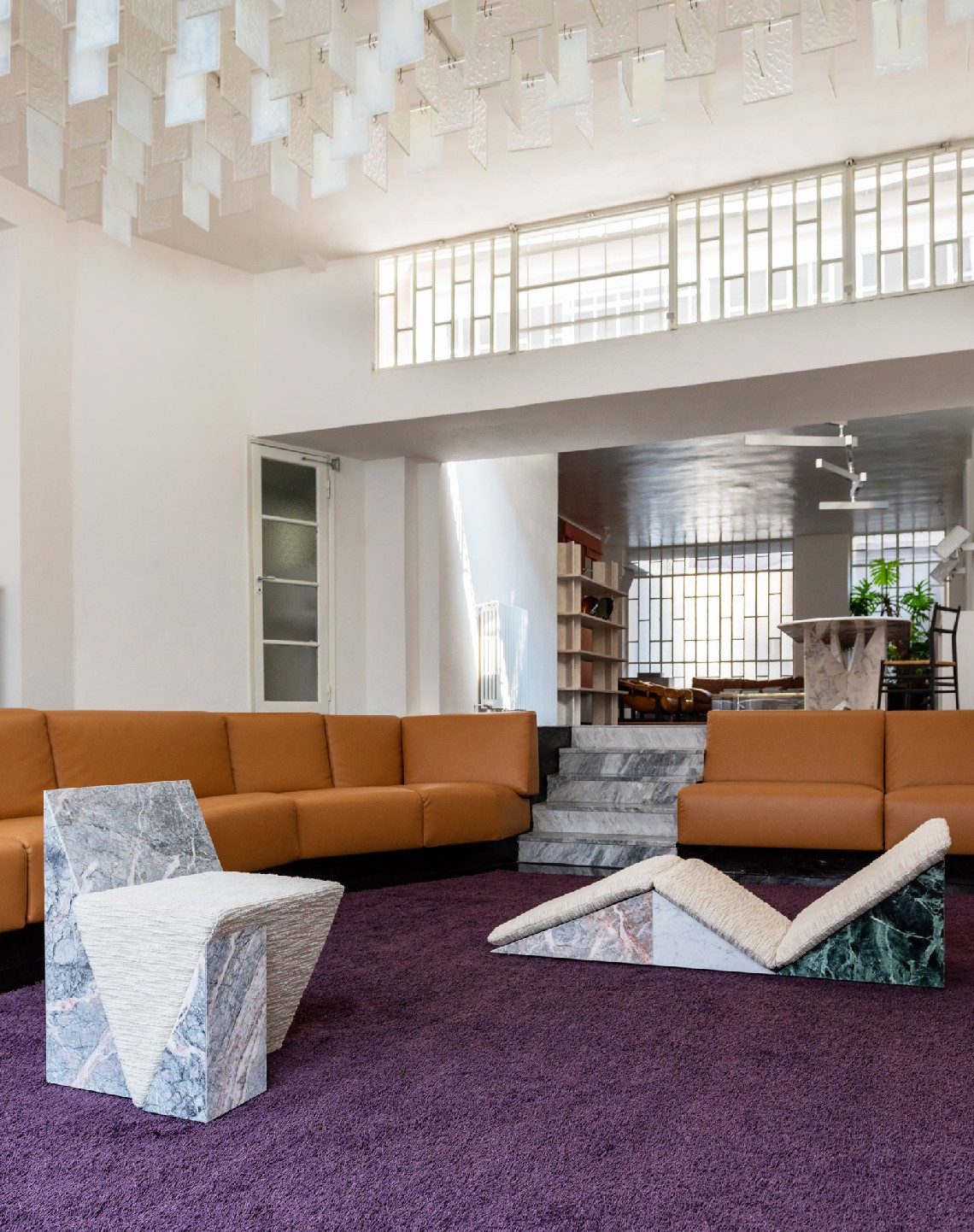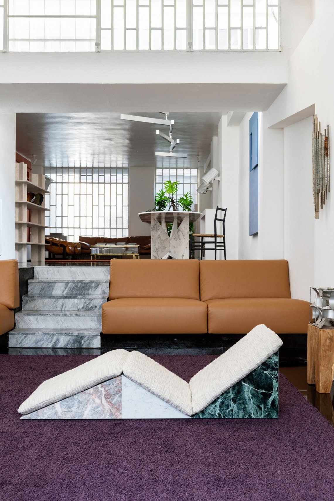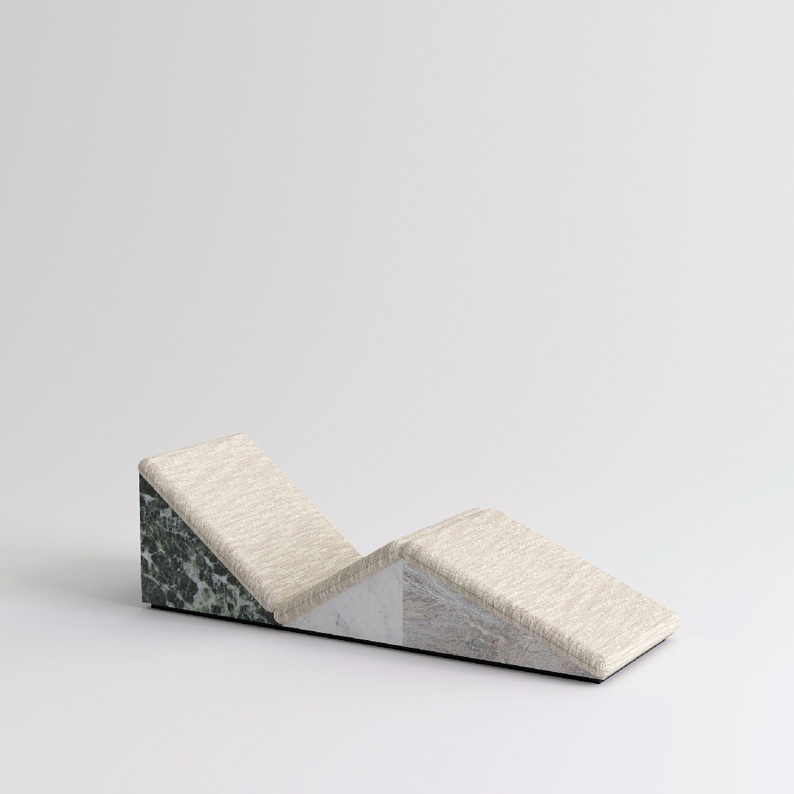 MARMINI I is an uncompromised architectural lounge chair built in Verde Alpi, Bianco Carrara and Fior di Pesco marble. To augment the seating comfort, an oversized cushion with a materic Lelievre fabrics covers the entire chaise longue.