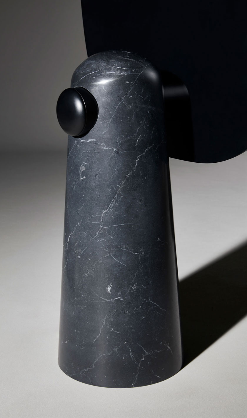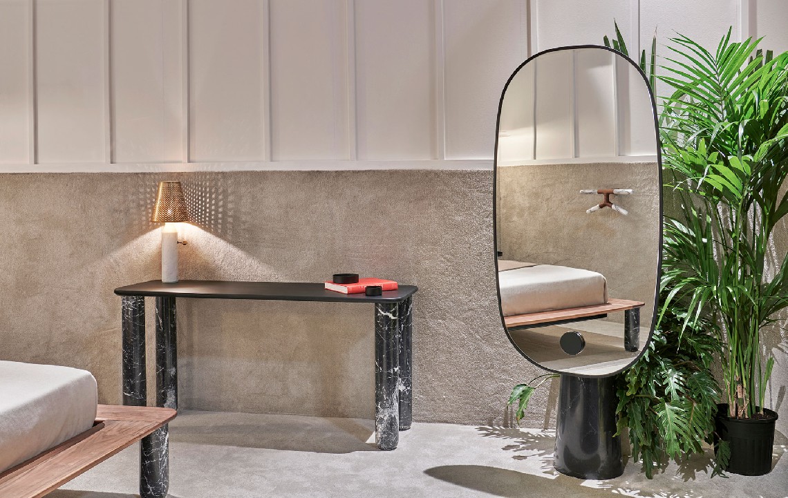 Iconic is a mirror that proudly stands as a statue. The white or black marble base pedestal supports a thin metal structure.