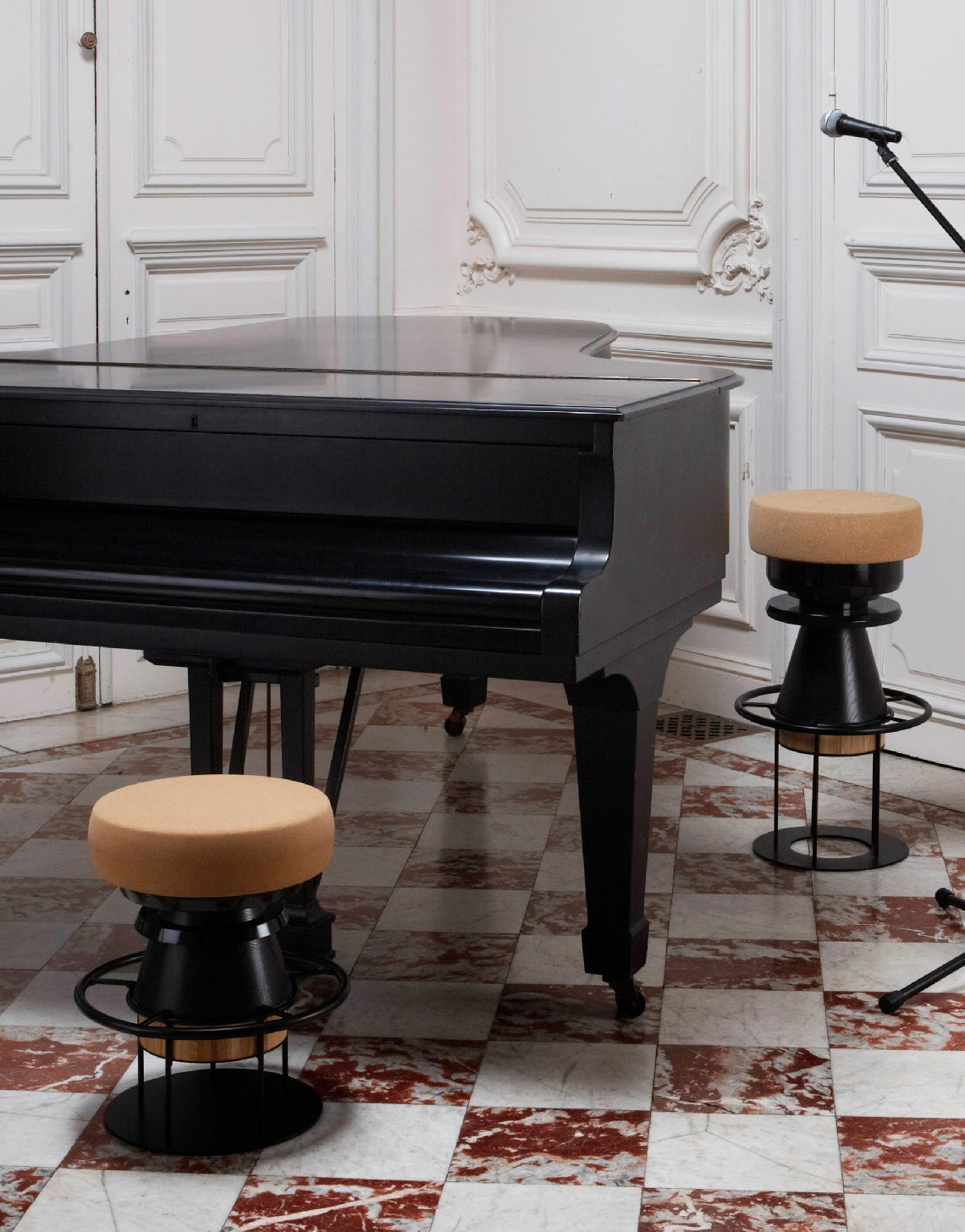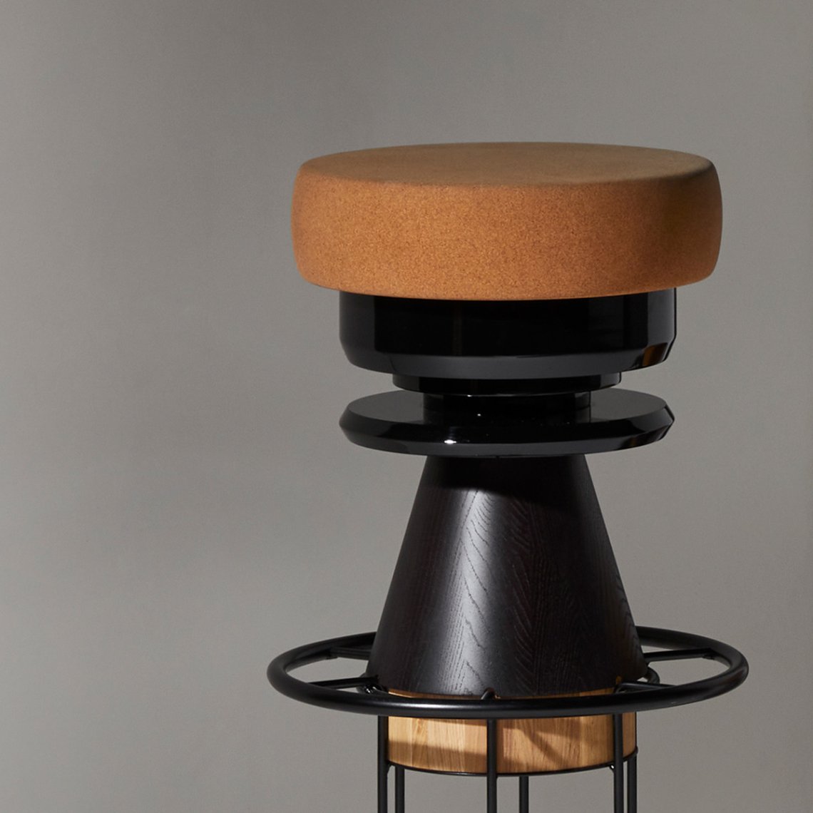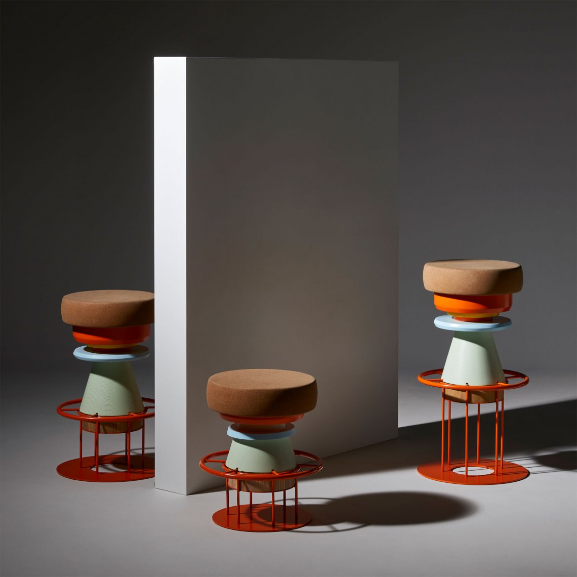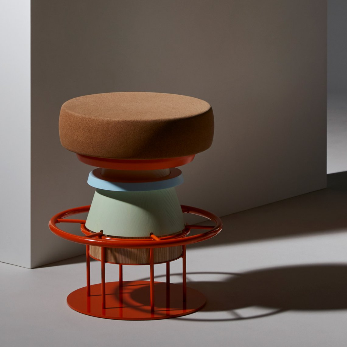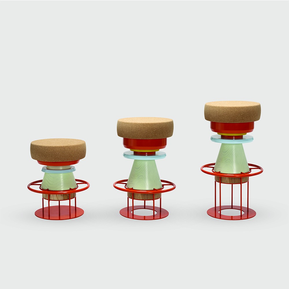 Tembo is a sculptural stool that combines a wood and metal body with a solid cork seat. The designers drew their inspiration from the African tam-tams(Tembo means elephant feet in swahili) white giving a nod to the Memphis group aesthetics.