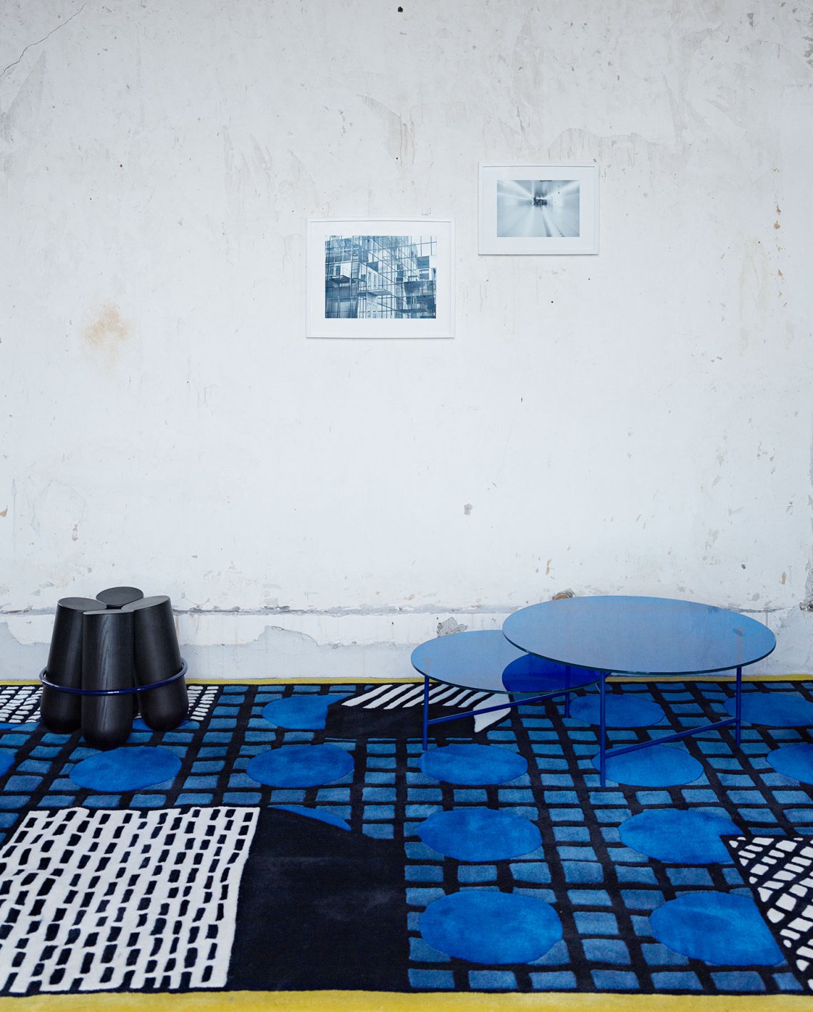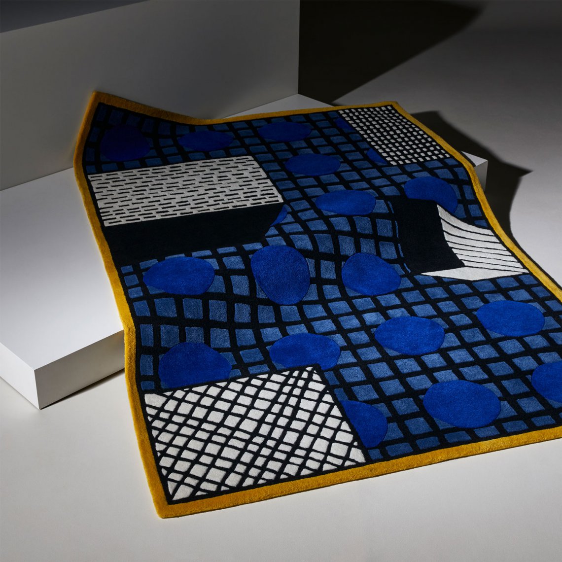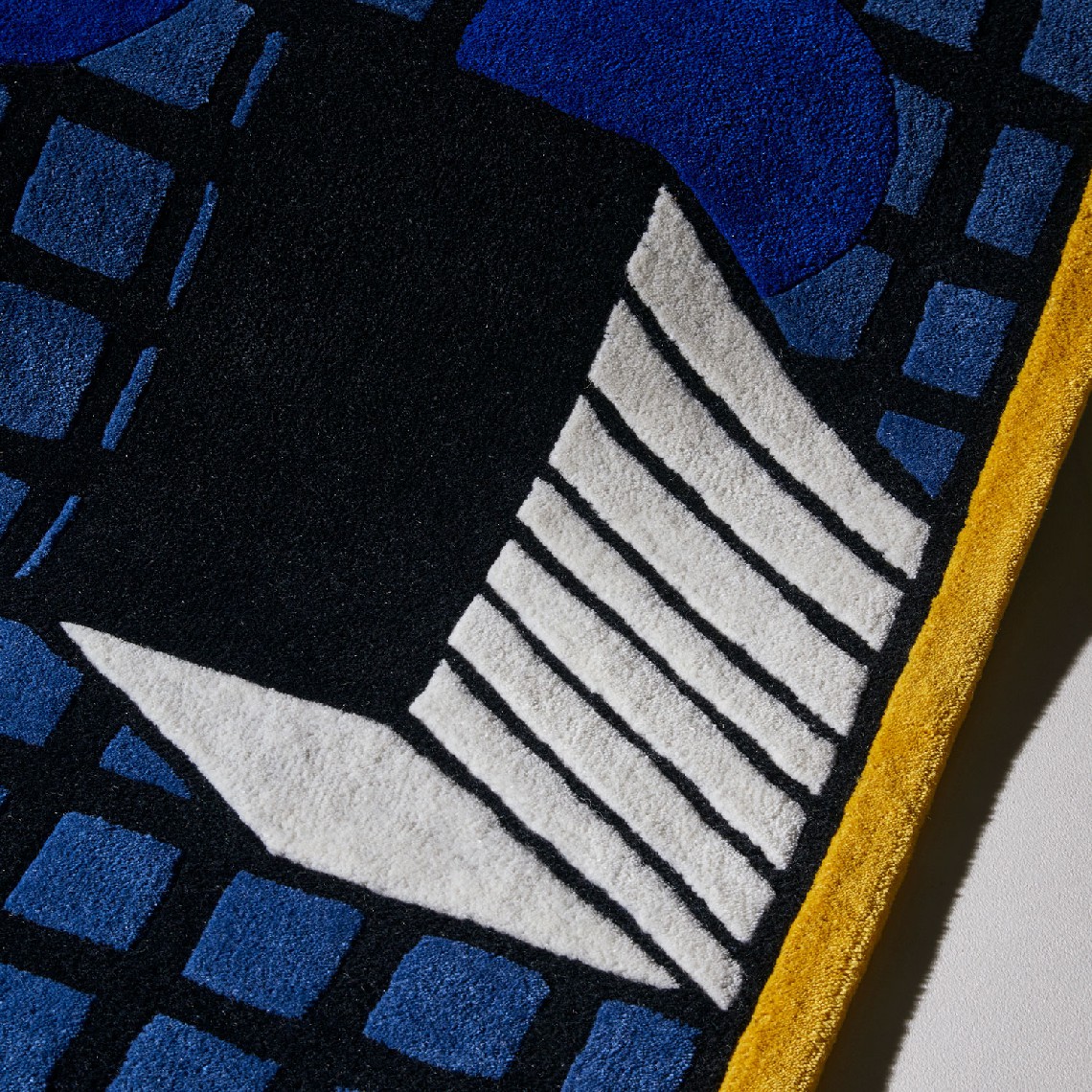 Tapigri is a construction of layered geometric patterns topped by 3 elements that give the rug an almost architectural presence.