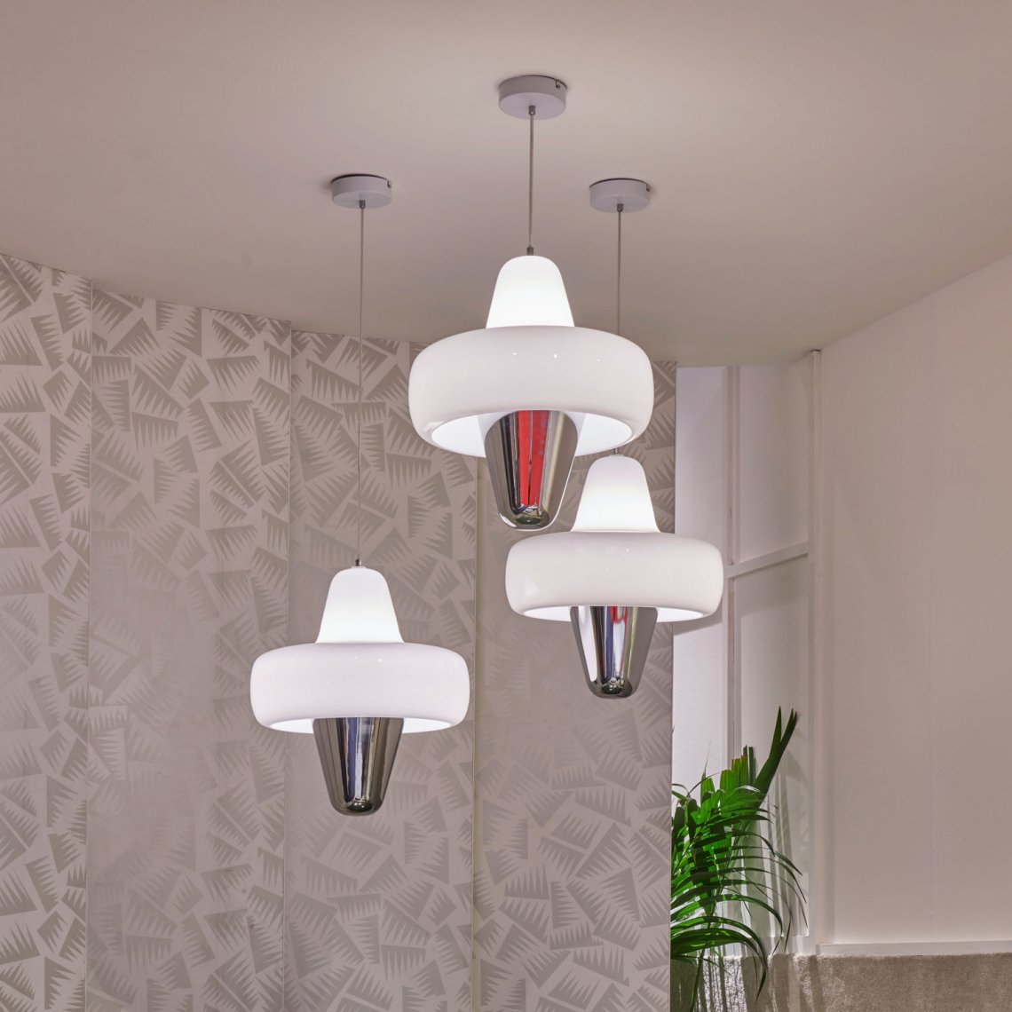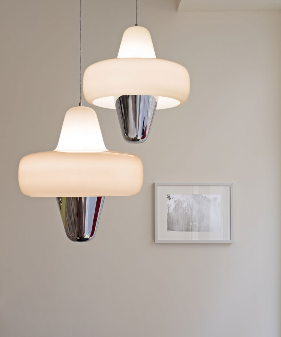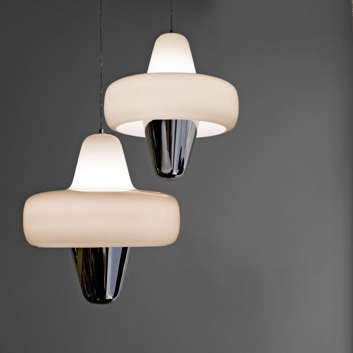 Swan is a large pendant lamp with smooth and curvy lines. Swan is made of an opalescent shade in blown glass floating above a chromed metal cone.