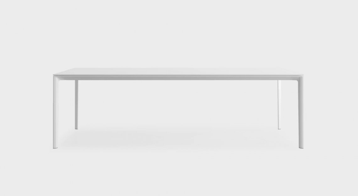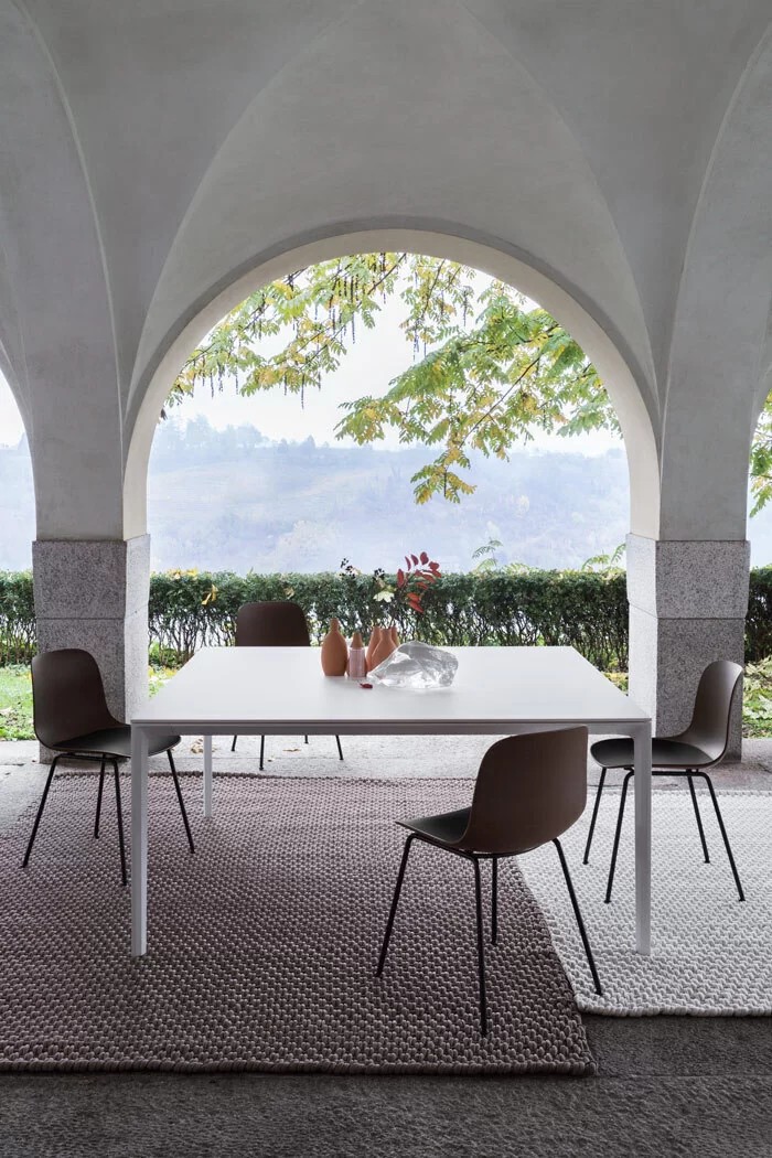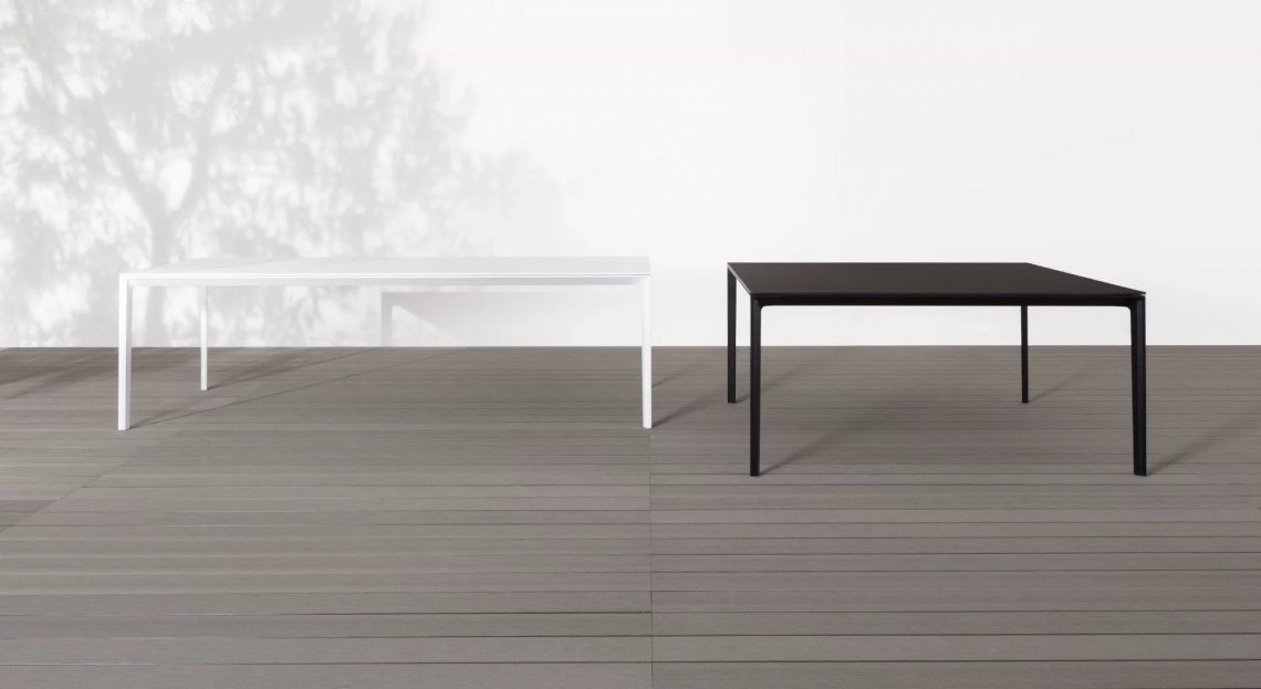 Nelle sue proporzioni perfette, in bianco e in nero per risaltare l’essenzialità delle linee, il tavolo ADD T Square prosegue outdoor l’eleganza minimale e la convivialità del sistema ADD. Il piano è in laminato HPL Fenix?. E grazie alle gambe in fusione di alluminio, che formano l’angolo nella versione singola e permettono di unire i telai, le soluzioni compositive non conoscono limiti.