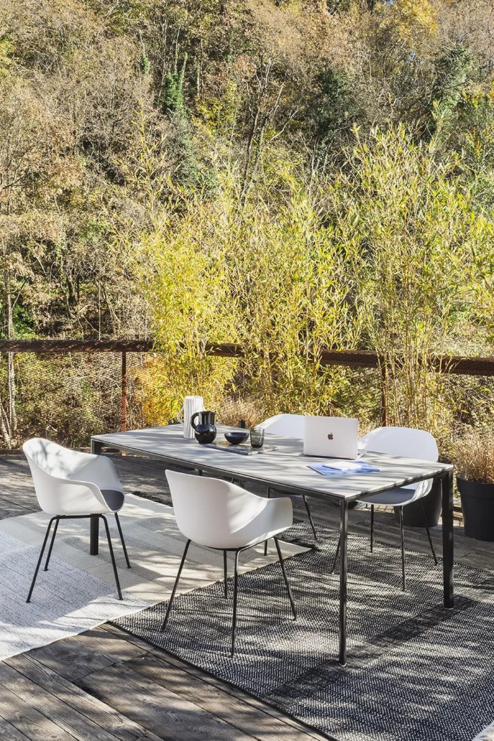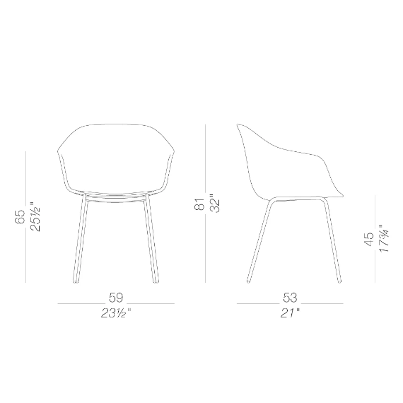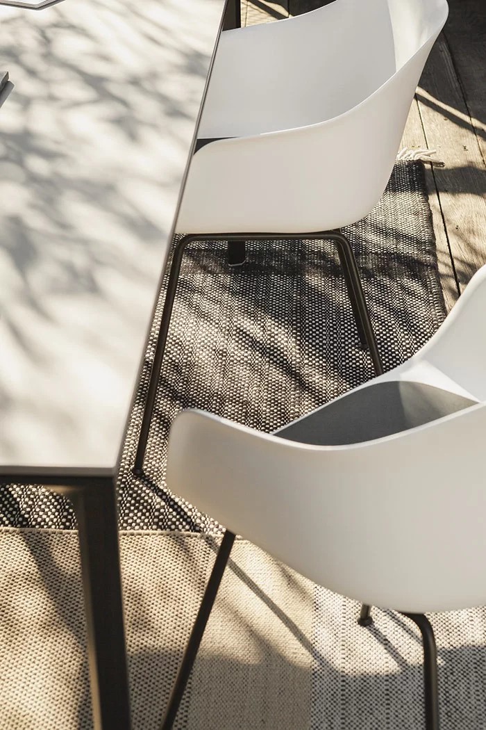 Base a 4 gambe in acciaio cromo satinato o verniciato a polveri. Piedini in nylon con feltro integrato.