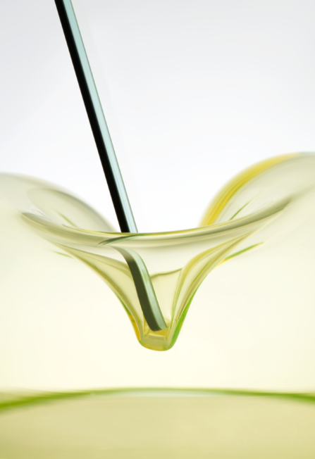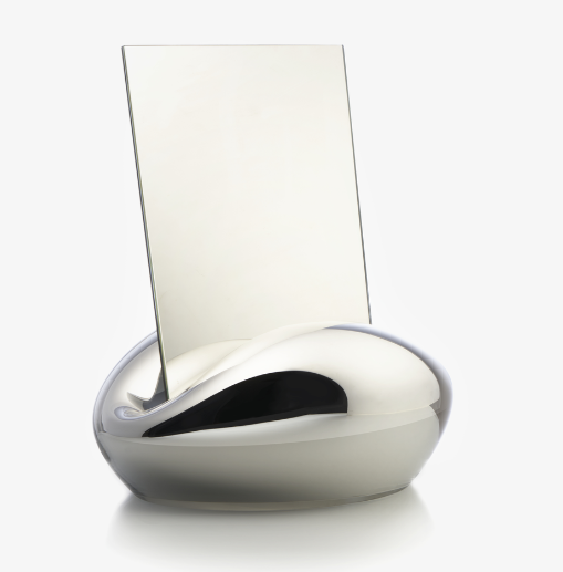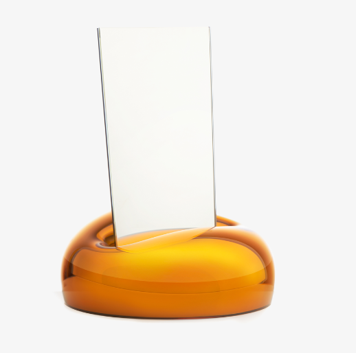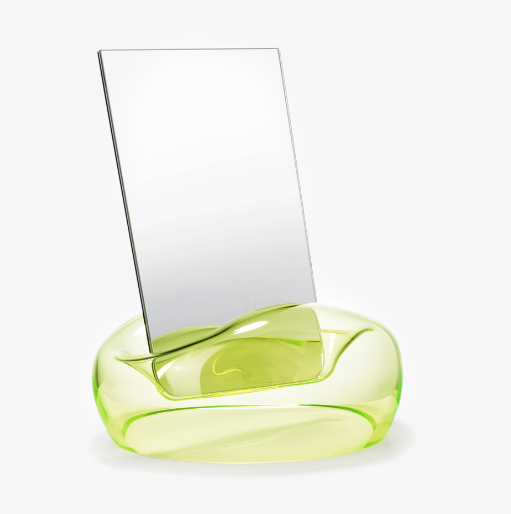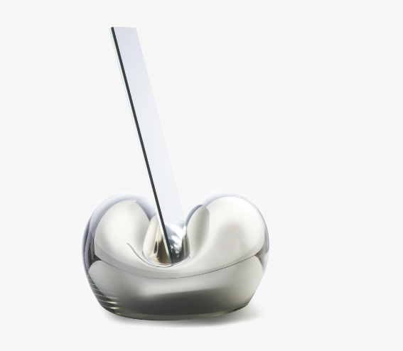 The mirror Kiss allows glass to be moulded in an organic way, forming the shape of a human heart before settling into a larger, flowing form. The mirror itself presents a technical challenge – the fragile, reflecting sheet must be designed in a way that does not cause tension when it is placed in its stand. At the end of the production process, it is the skilled glassblower who kisses life into this reflecting bubble.