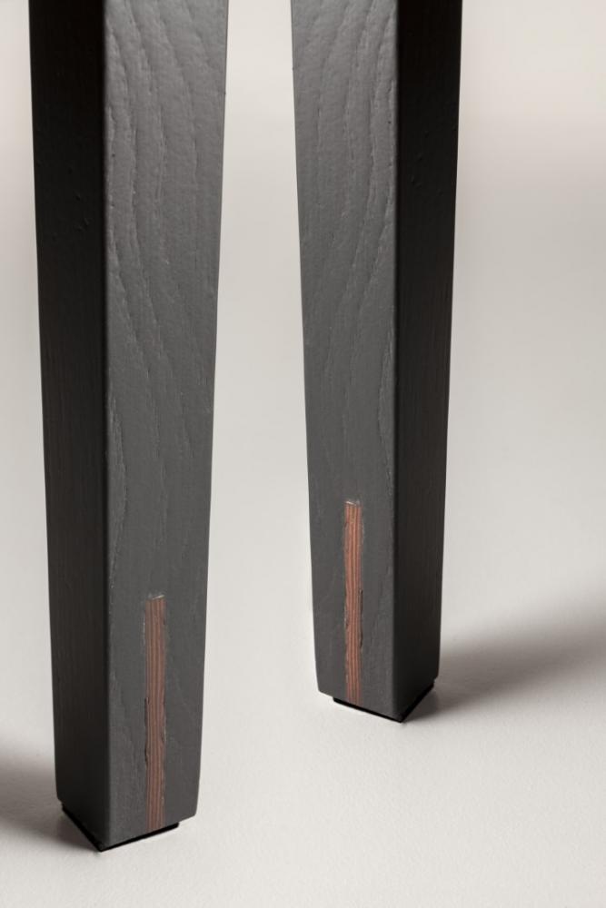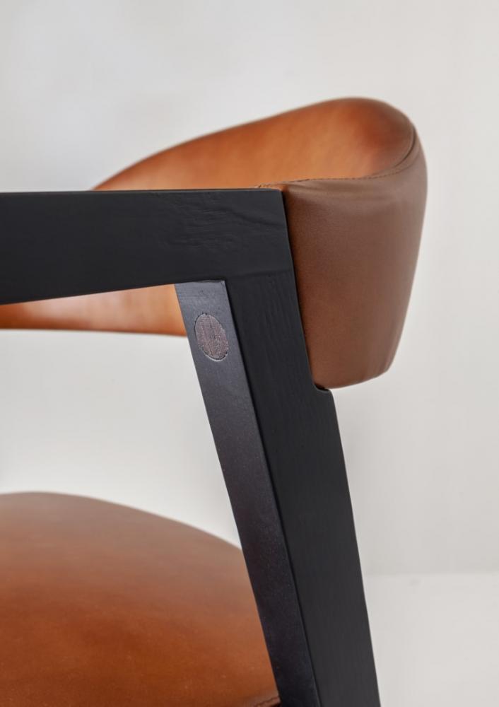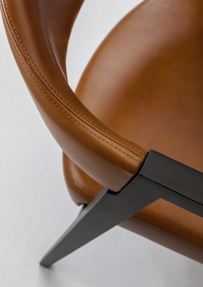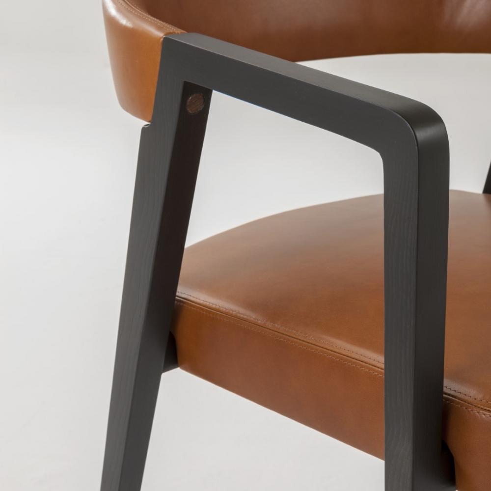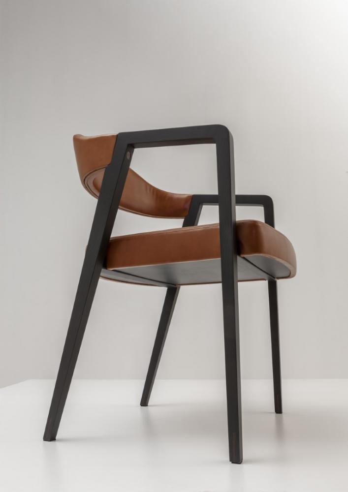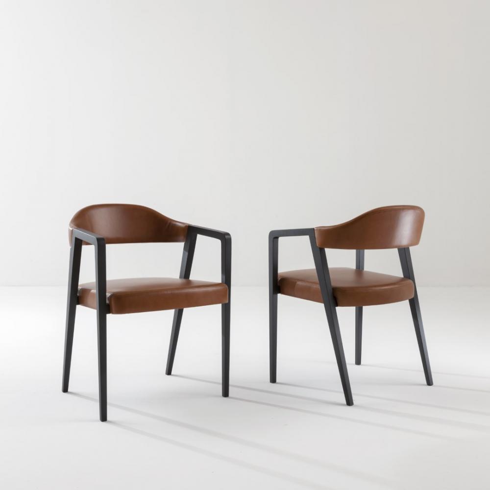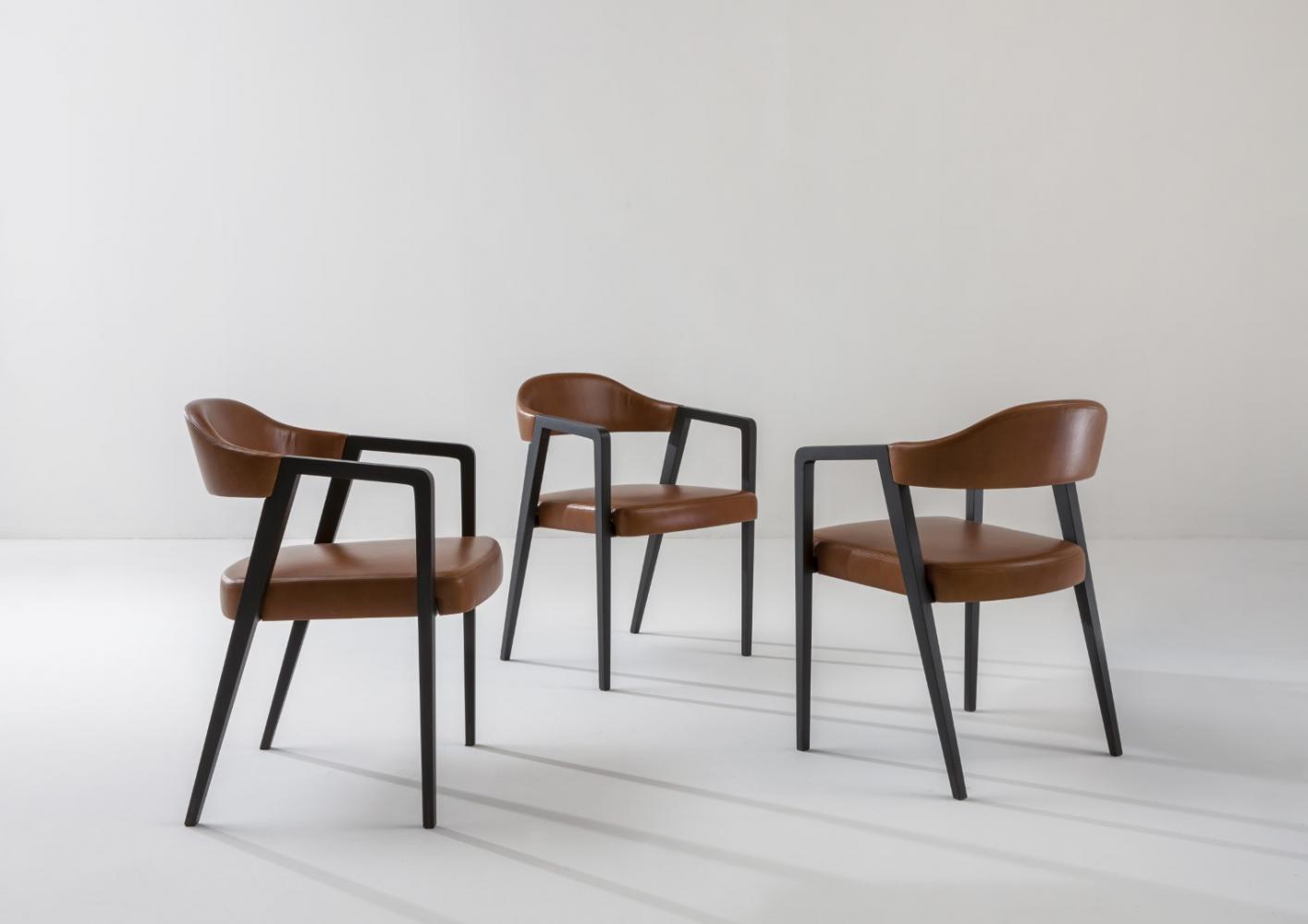 Chair with legs and armrests in plain, dyed or lacquered wood, and with seat and backrest upholstered in leather, velvet, or fabric.Legs adorned with vertical wood inlay.