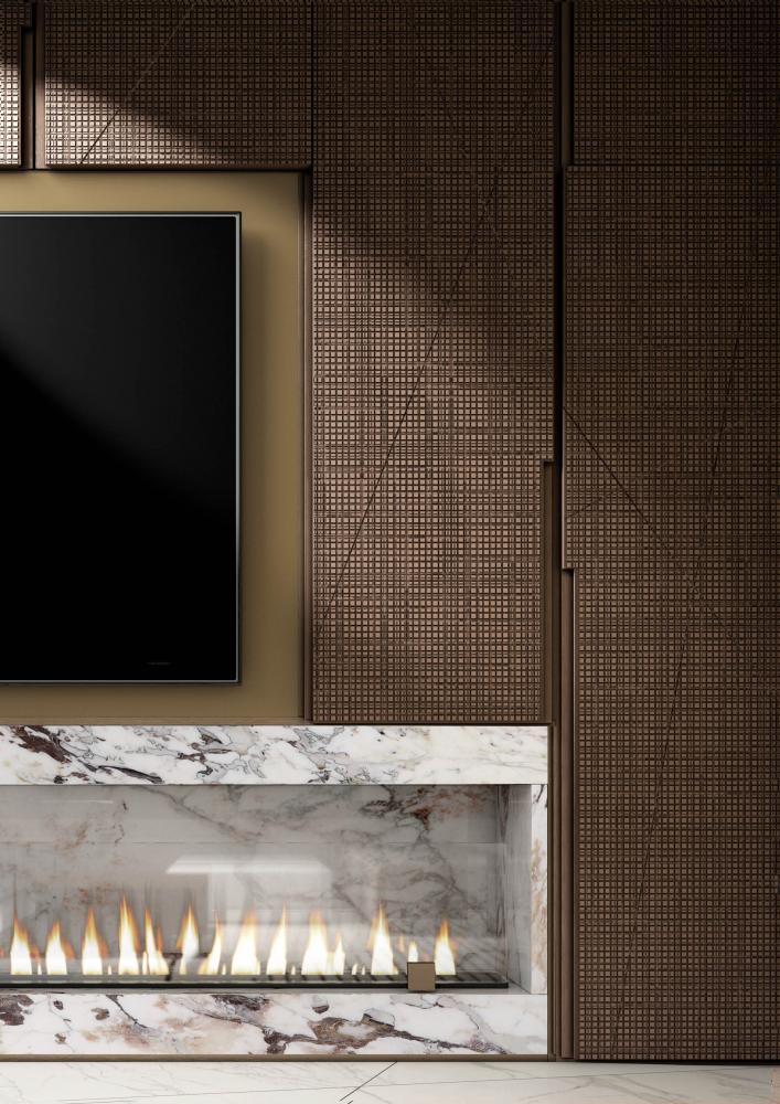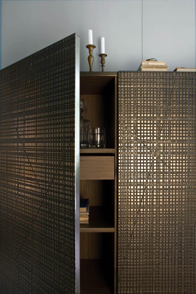 The Maxima day wardrobe systems are available in different finishes, such as the "Liquid Metal" finish, with various accessory options and integrated doors and wall panels, to create infinite compositions and allow complete customization.