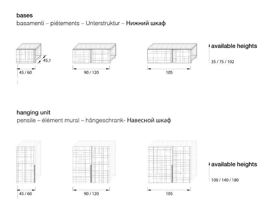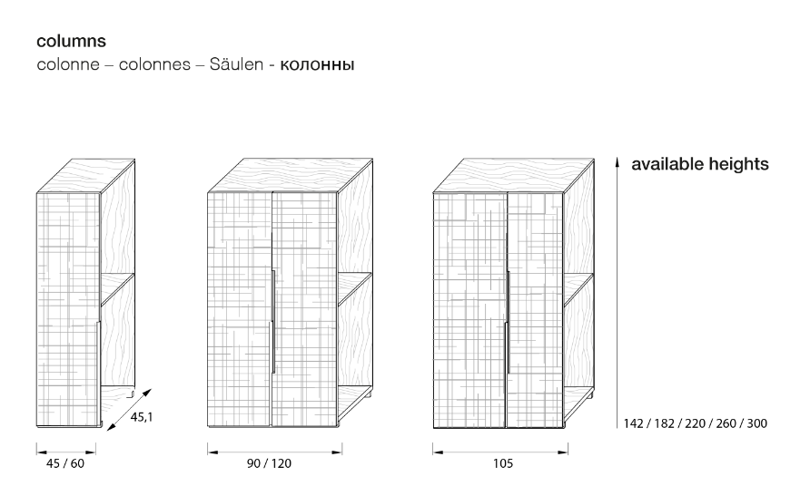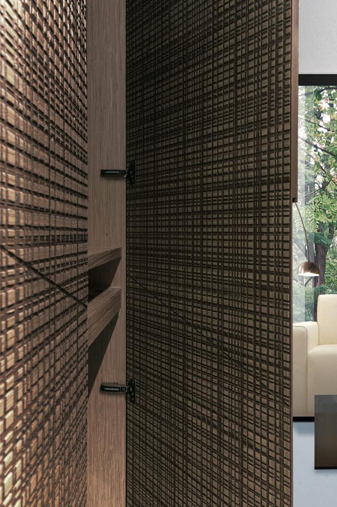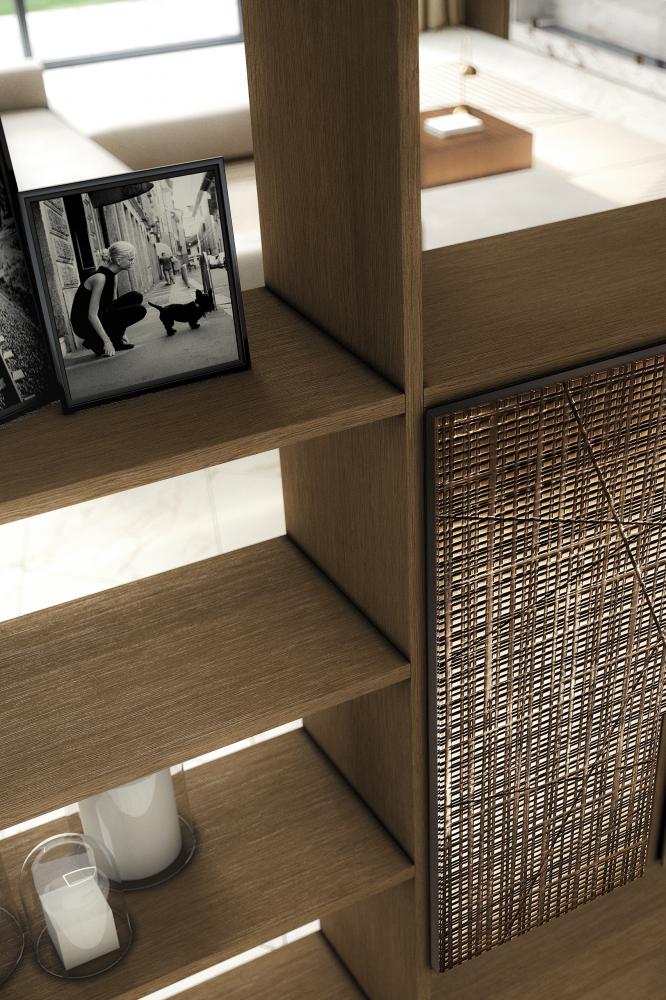 Wooden cabinet system with Maxima carving available in modules of different sizes, in all the wood finishes of the collection and in aniline-stained oak in all RAL colours.