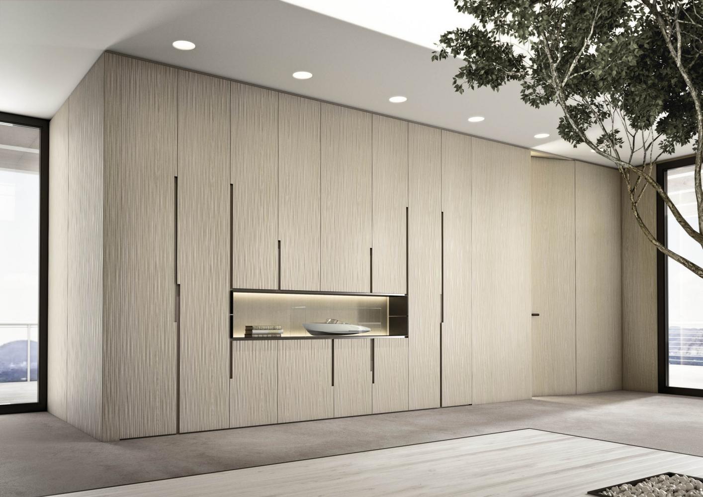 An accommodating solution with a unique design, which can be composed in multiple declinations of wardrobes, and combined with integrated wall panels and doors, open compartments or LED lighting.