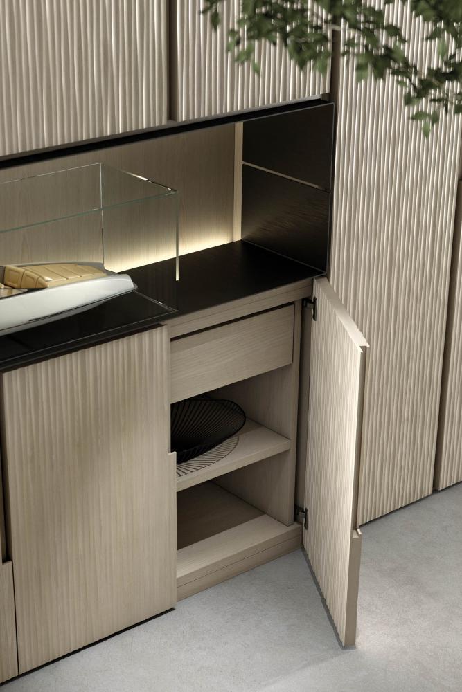 Wooden cabinet system with Onda carving available in modules of different sizes, in all the wood finishes of the collection and in aniline-stained oak in all RAL colours. The system is available with horizontal and vertical carving.