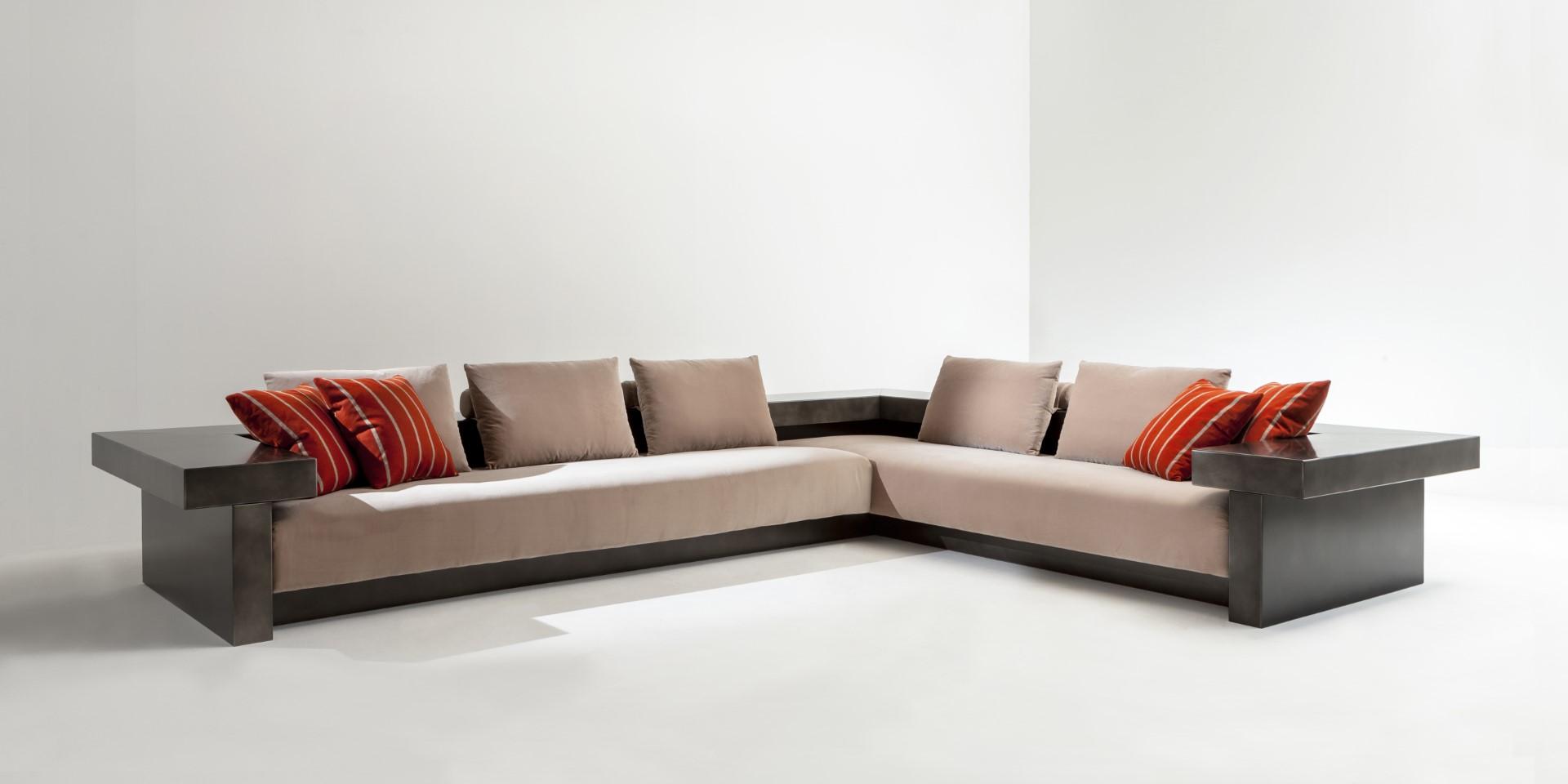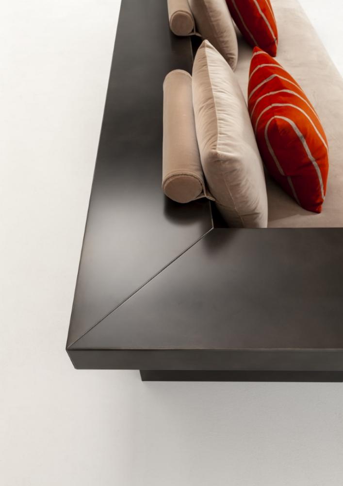 Characterized by wooden frame and armrests, available with a Delabré finish or covered by a lightweight marble slab. The armrests, available in various combinations and sizes, also serve as integrated tables.