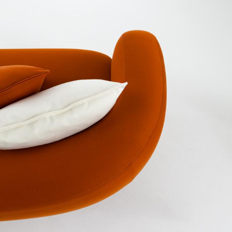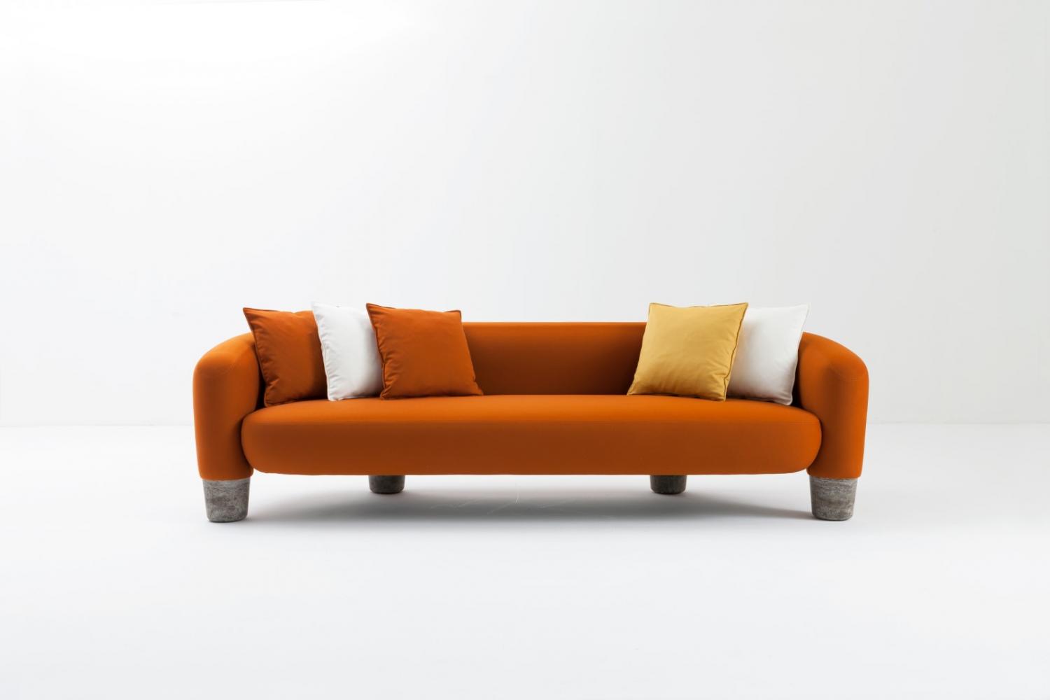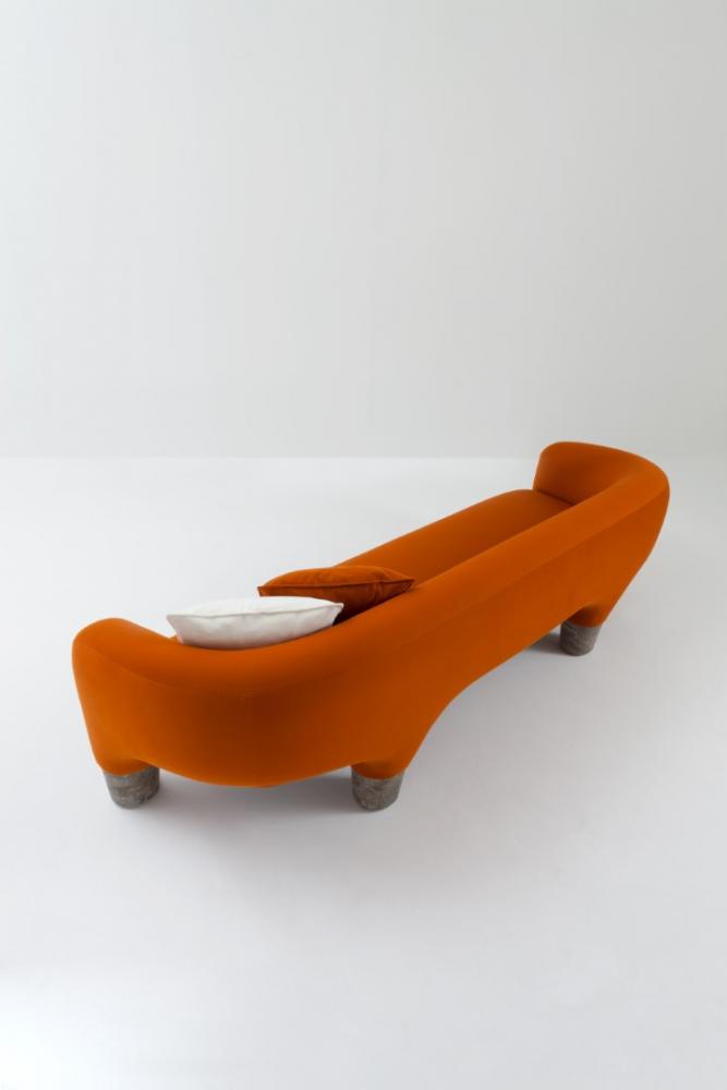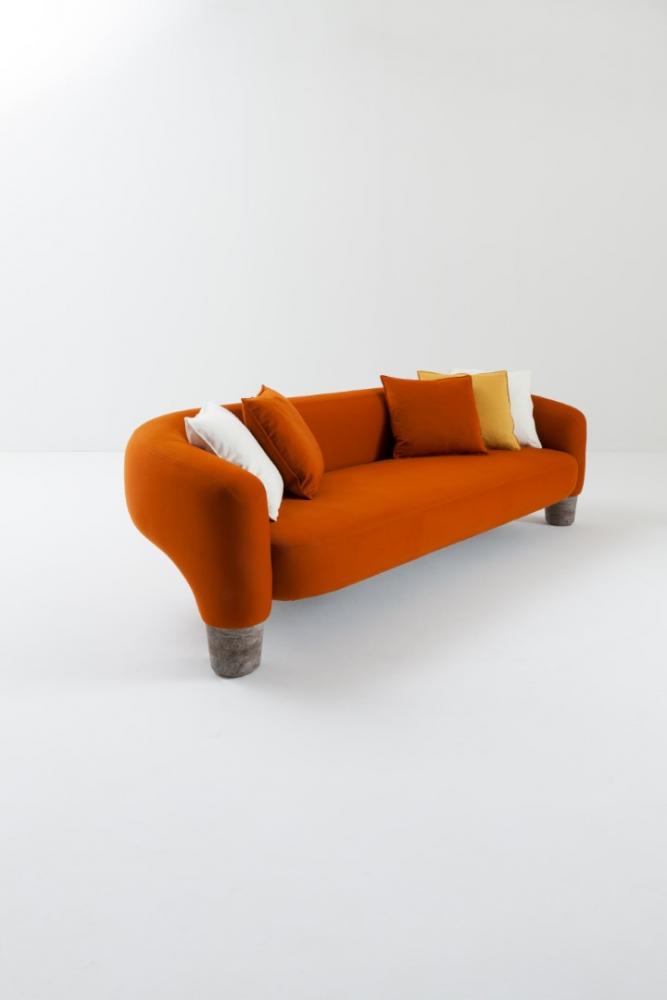 Upholstered sofa covered in leather, velvet or fabric, featuring four sturdy legs in solid marble or in solid wood.