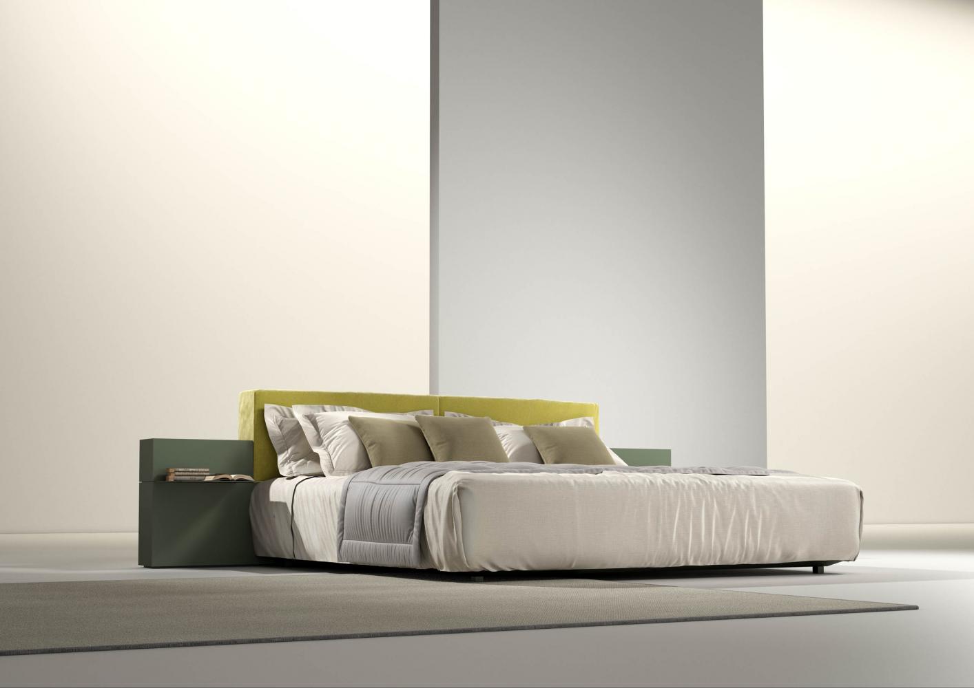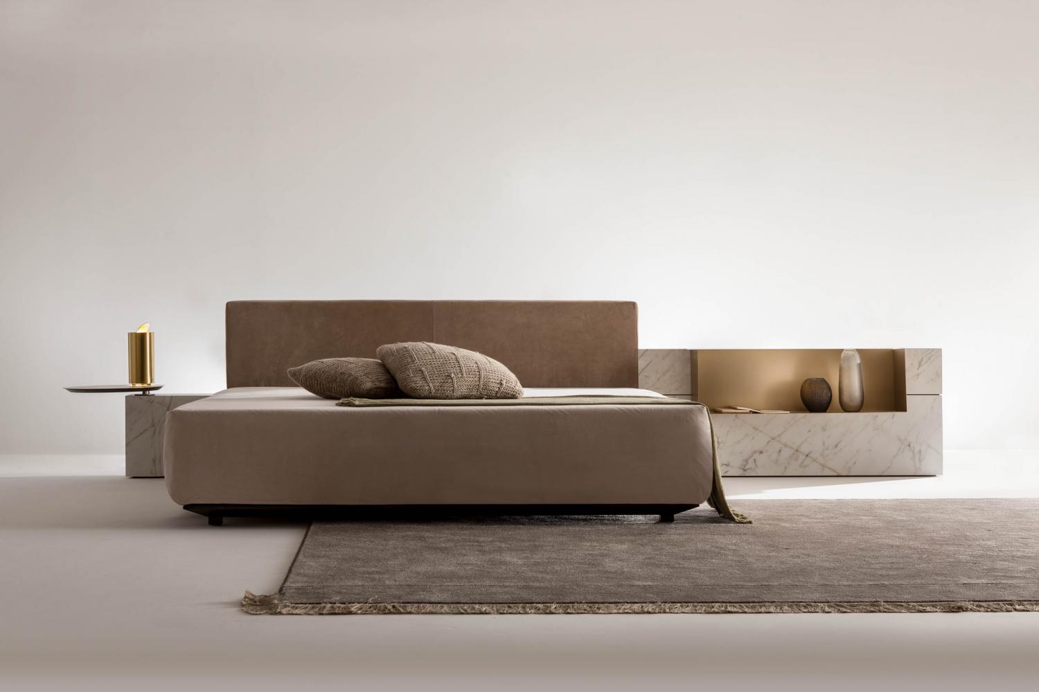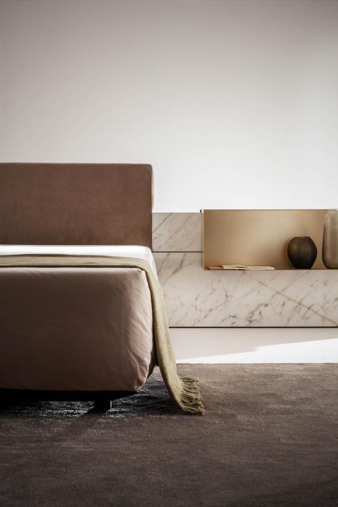 Thanks to the range of accessories, shelves and open storage units you can customize the different compositions. The various finishes available for the headboard characterize the taste and aesthetics of this bed system conceived in continuity with the "Symphony" storage system, designed for the living space.