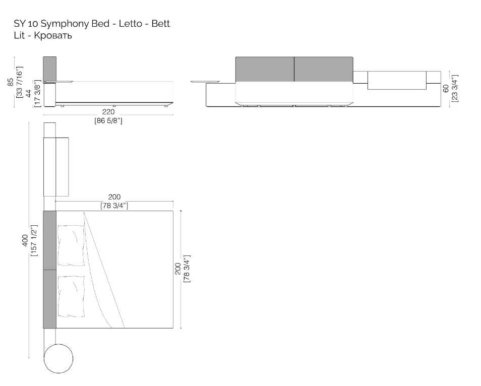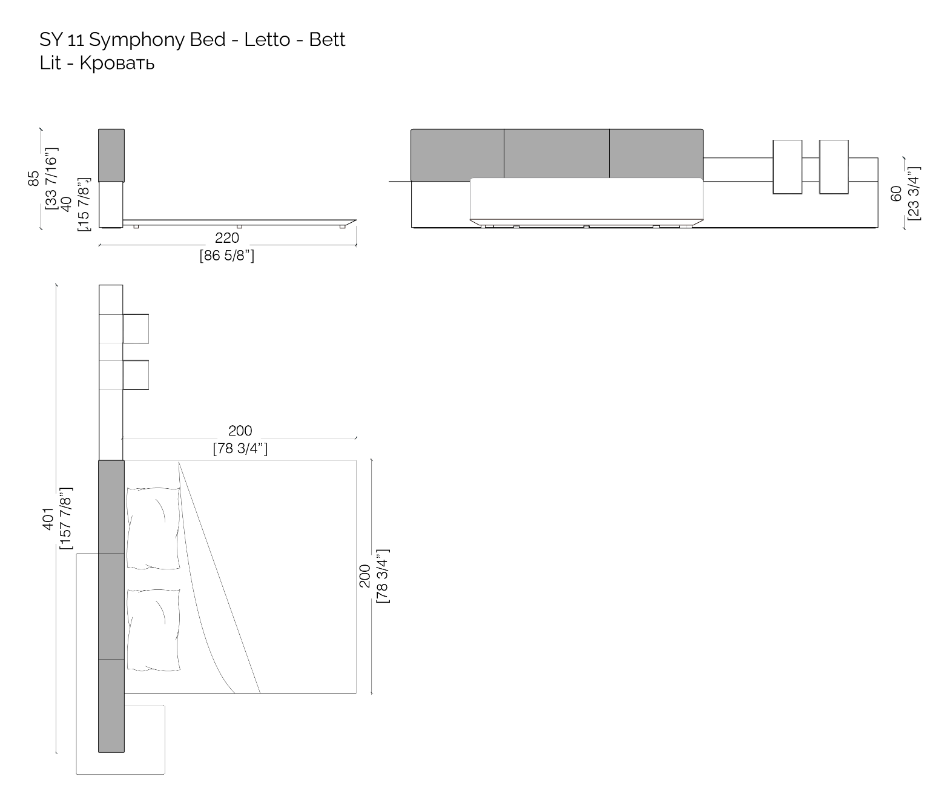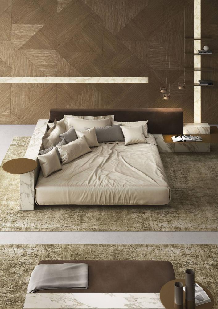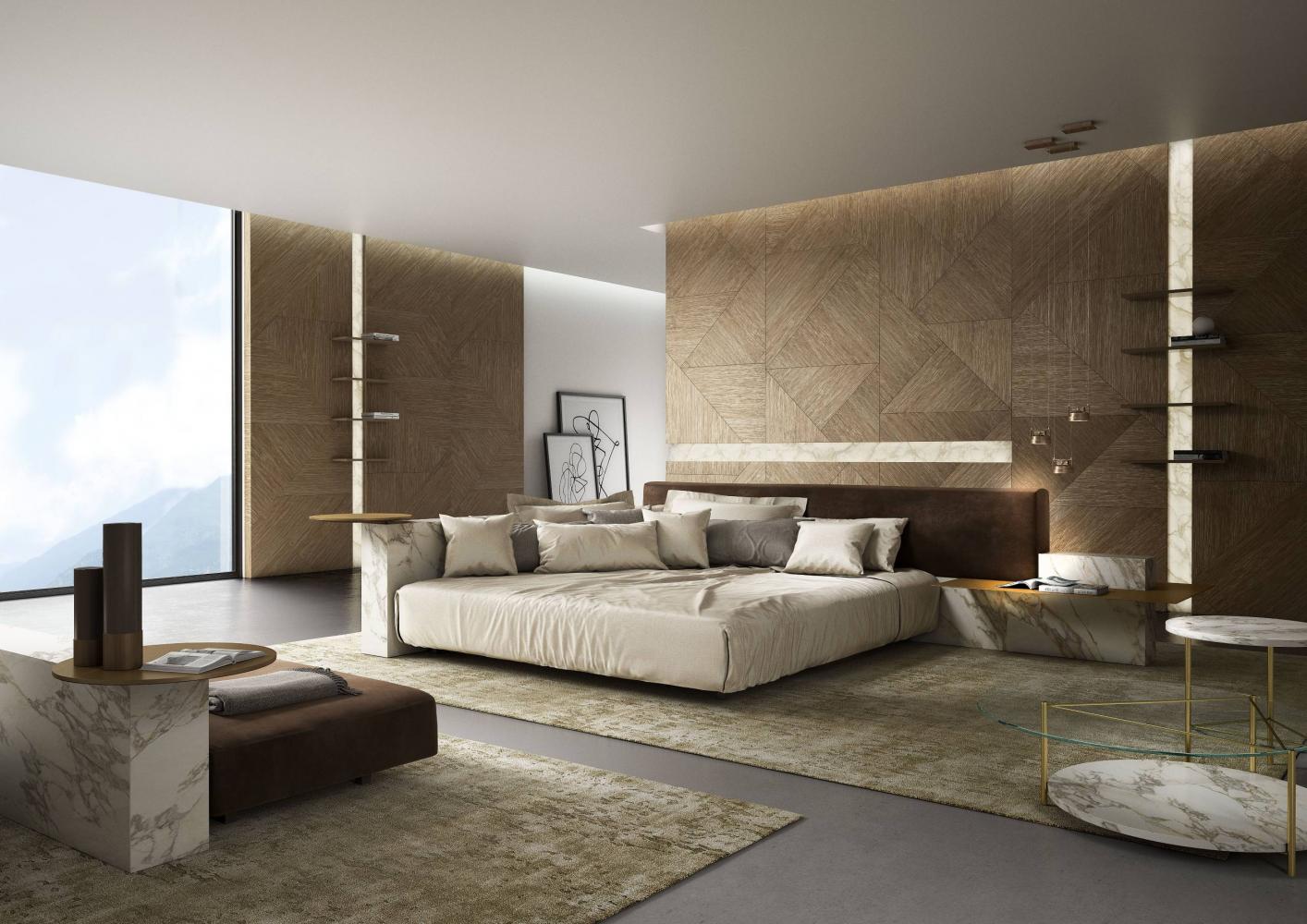 Thanks to the range of accessories, shelves and open storage units you can customize the different compositions. The various finishes available for the headboard characterize the taste and aesthetics of this bed system conceived in continuity with the "Symphony" storage system, designed for the living space.