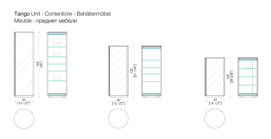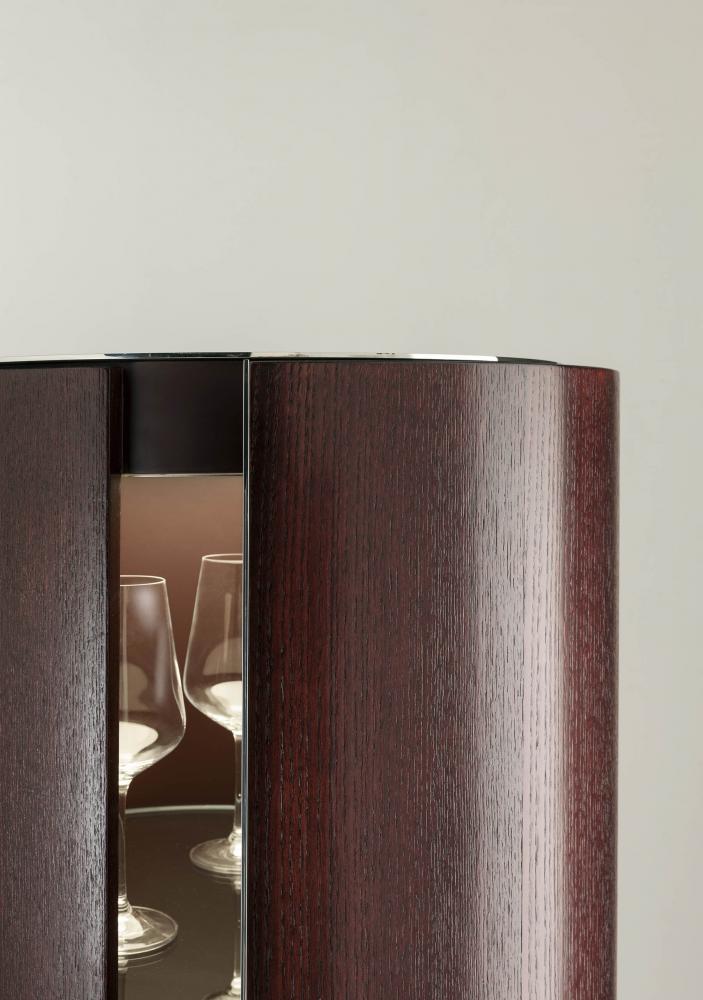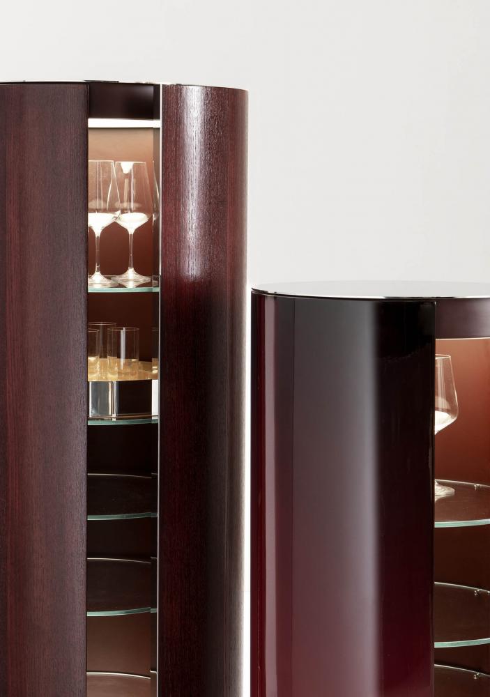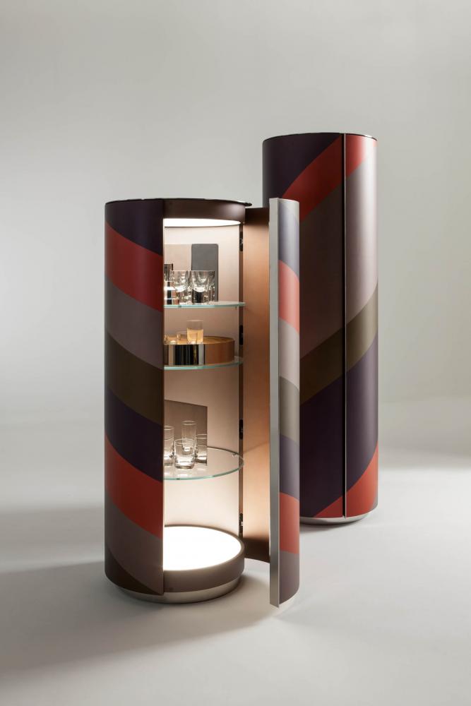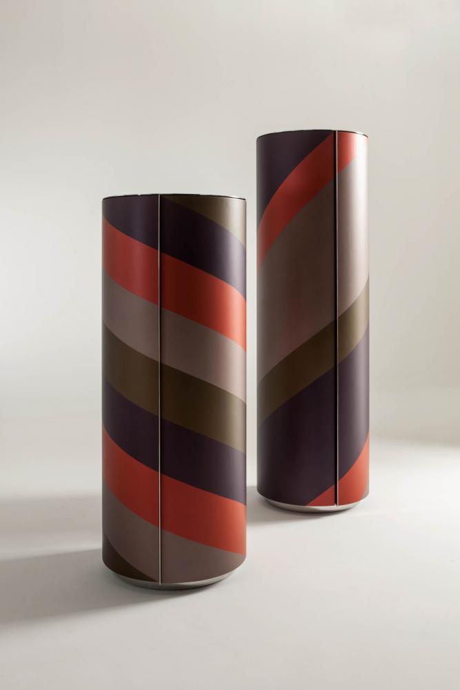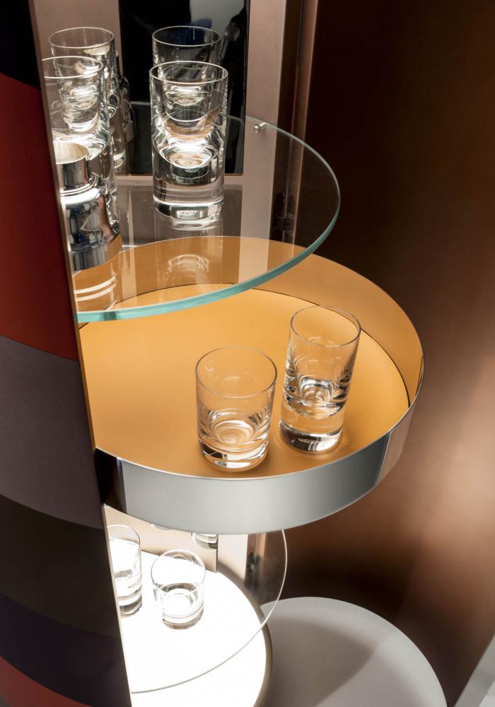 "Tango" is a set of containers born from the research on the counterpoint of proportions, diagonals and volumes. The two rhythms of helical bands that surround the cylinders are inspired by the mooring poles of the boats on Lake Como. The containers enclose an internal organization in circular glass tops, with mirror-polished steel accessories that multiply the geometries in a game of reflections.