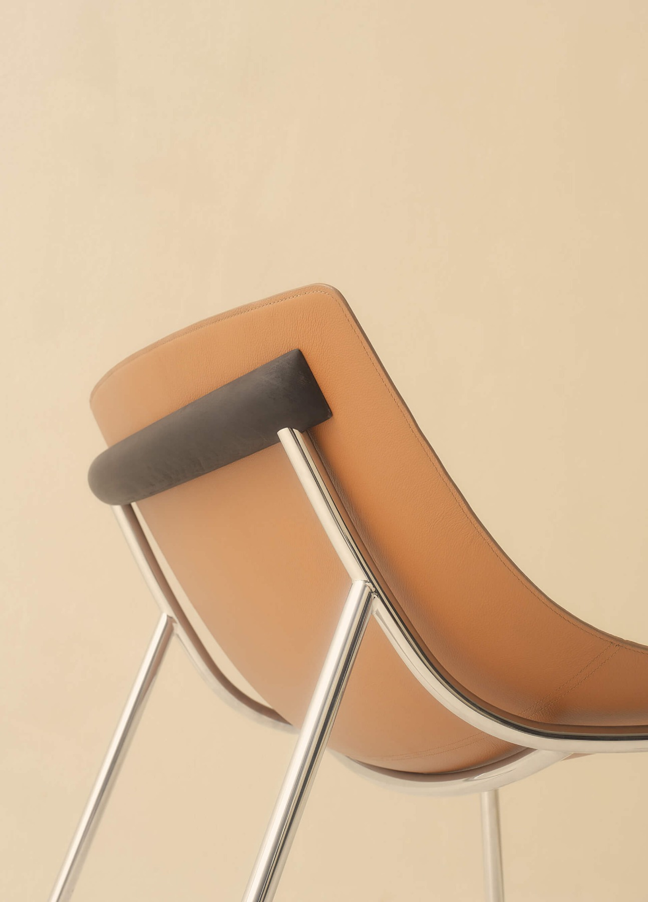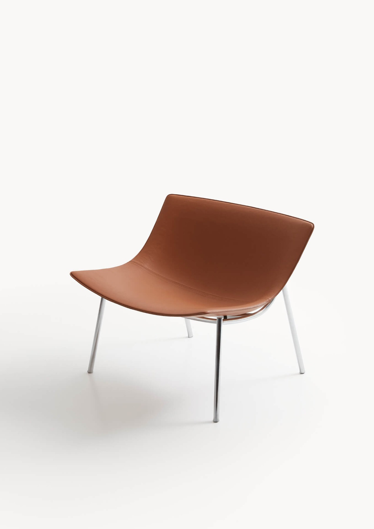 Omega is a lounge armchair created from a blend of history, materials and iconicity. Its elegant and contemporary design is inspired by the stylistic features of the 50s: from this combination a timeless proposal takes shape where vintage charm blends with a modern aesthetic. Characterised by a lightly padded printed shell covered in leather or vegan leather, Omega combines the softness of the seating shape with the solidity of the metal structure. A horizontal wooden element welcomes and supports the backrest of the monocoque chassis, whose shape is emphasised by a stitching that defines its edges.