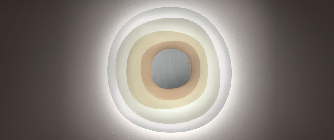 Beta, designed by Paolo Franzin, is a wall and ceiling lamp that plays with the nuances of its light source. Its simple gradient of color on a glass plate results as a beautiful white when turned off but becomes a display of beautiful fading sand colors when illuminated. The result is something in between a functional lamp and a work of art. Beta is available in two sizes, Big (52 cm - 20 1/2") and Small (35 cm - 13 3/4").