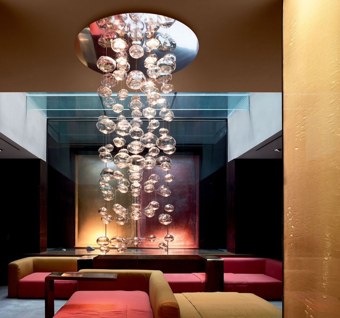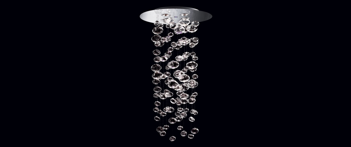 Disegnata da Patrick Jouin, Ether è uno dei design più straordinari e affascinanti del catalogo Leucos. La lampada è formata da una cascata luminosa di sfere di vetro borosilicato soffiato trasparente. Lavorate a mano, le sfere possono avere tre volumi diversi formando una cascata di vetro scintillante dall'impatto visivo ipnotizzante. Ether è disponibile in 3 versioni standard (Ether S, Ether S 90 e Ether S 150), ma può essere personalizzata in qualsiasi dimensione, finitura o configurazione. un LED RGB incorporato opzionale (controllato separatamente tramite telecomando incluso) illumina le bolle con un'ampia gamma di opzioni di colore a scelta. Scenografica e sontuosa, Ether è una lampada che trasforma gli spazi con personalità, diventandone la protagonista.