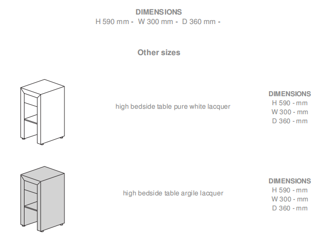 Made from panels of veneered or lacquered MDF, fixed together at 45° to each other. Each bedside table has a clear glass surface, and a drawer.