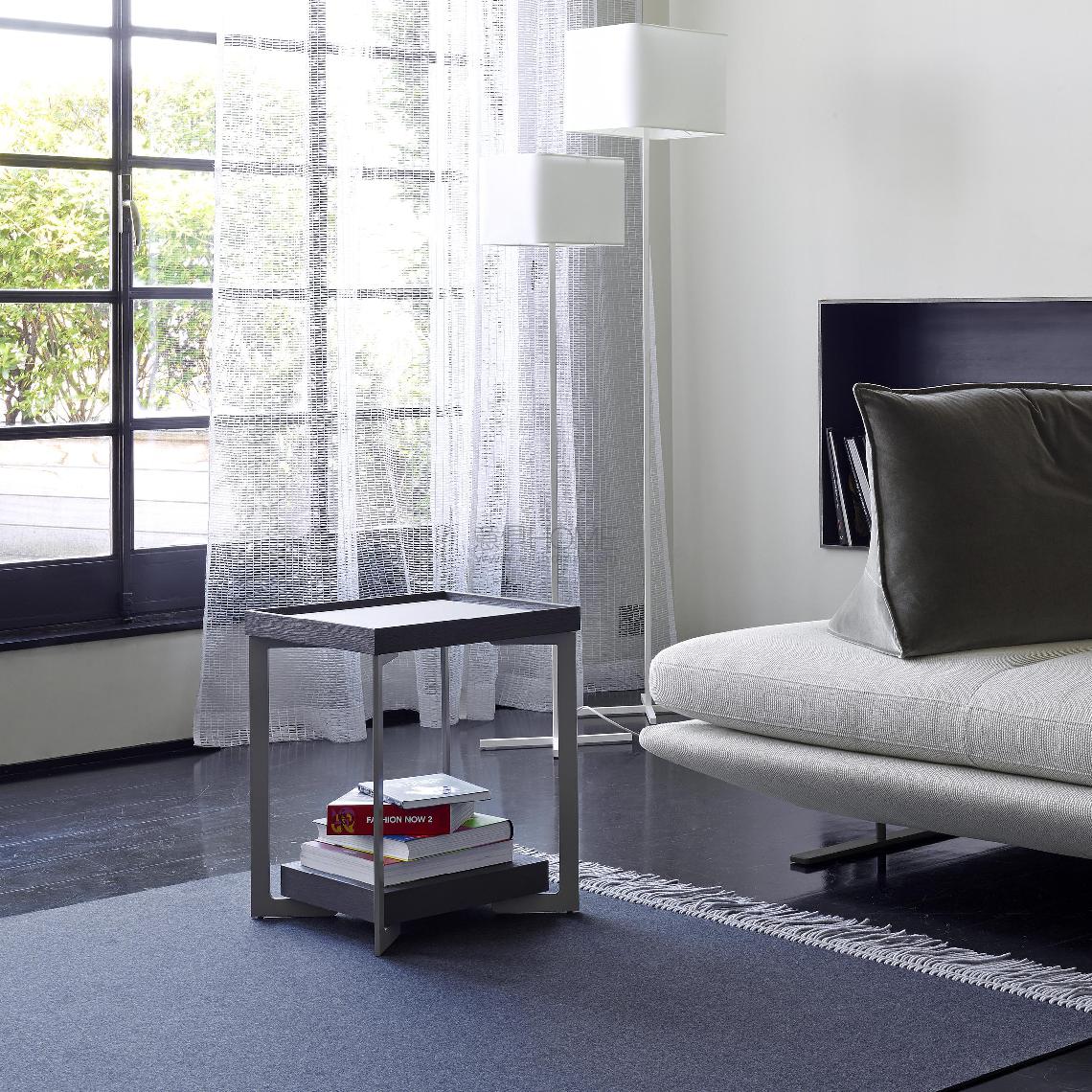 Sofa end table with base in argile lacquered steel and thick lower surface in sawn oak. The upper surface, also in oak, comprises a Pebble- coloured linoleum top glued onto a 5 mm thick HPL laminate. For ease of maintenance the raised linoleum top may be easily removed using the screws underneath. - Bedside table with base in argile lacquered steel and lower chest in argile or vieux rose lacquered sheet aluminium. The oak upper top incorporates a Pebble-coloured linoleum surface which is glued onto a 5 mm thick sheet of high pressure laminate. For easy maintenance, the raised linoleum top may easily be removed thanks to the wheels located beneath it.