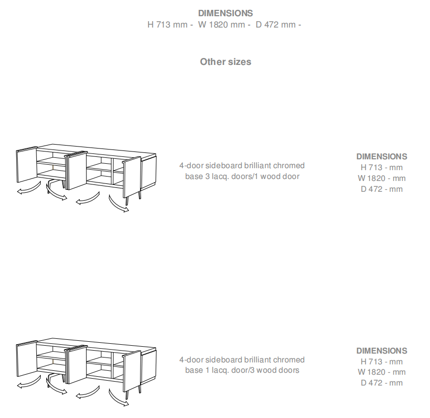 CONCEPT: these one-piece items are reasonably-sized and permit a furnishing style which is less constraining and more nomadic. They pieces will appeal to all those who favour an unstructured approach to furnishing. SIDEBOARD WITH HINGED DOORS: the basic version is a 4-door sideboard. The right-hand door may be replaced by a block of 2 drawers (upper drawer with handhold, lower drawer with 'push' mechanism) or even with an open niche with a central shelf (with rear return) within a lacquered aluminium frame, similar to the Mixte dividing panel. The two left-hand doors open to reveal a central full-width shelf and with no intermediate panel. The third door (and the fourth in the case of the 4-door version) conceals a space the same width as the door. Doors are all in the same finish (sawn oak or lacquer), or with a contrast cutout (wood on lacquer, lacquer on wood, one lacquer colour on another).