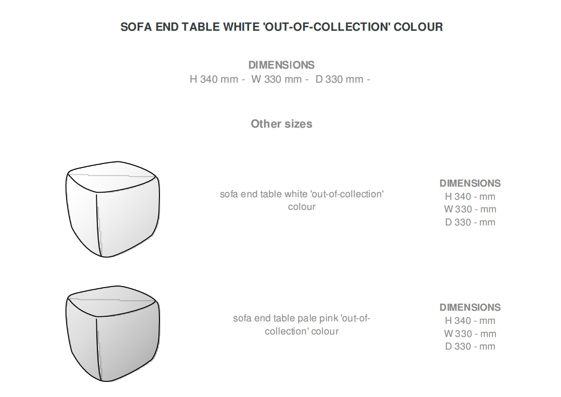 Sofa end table in enamelled earthenware. The upper section is reinforced with expanded polyurethane foam, which is injected into its interior. Max. recommended load : 40 Kg.