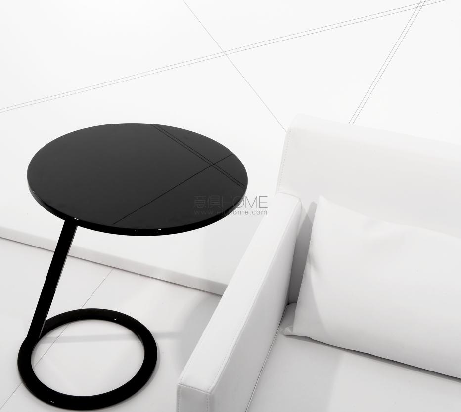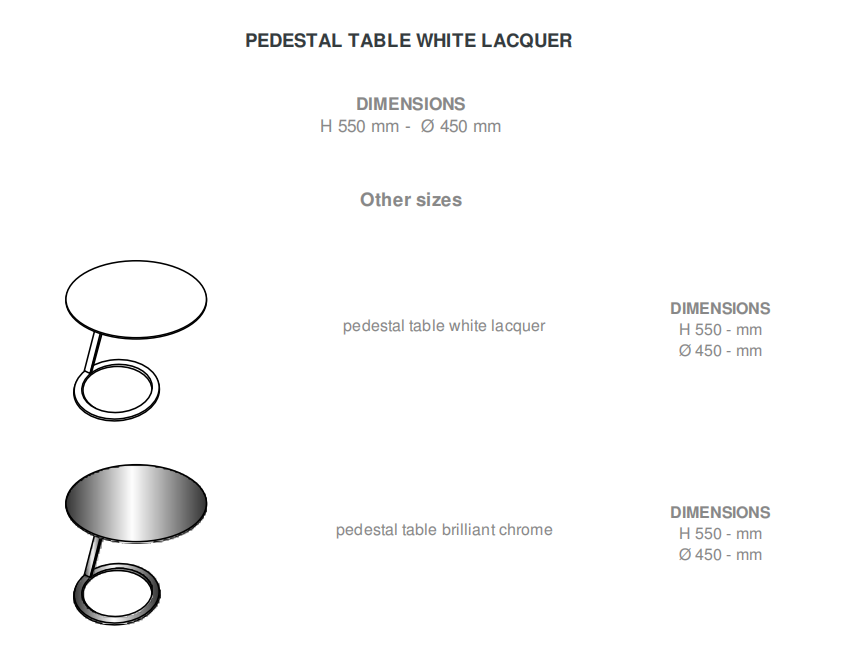 Pedestal table with top & base in white or black lacquer, or with brilliant chrome base and highly polished steel top, or with brilliant-chromed base and varnished aluminium-lacquered top. May be used as a sofa end or bedside table.