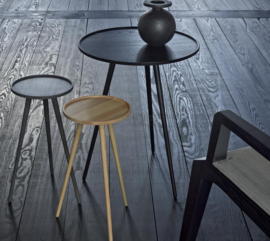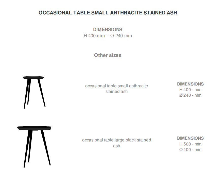 Occasional table in satin-finish natural varnished solid ash or in satin-finish anthracite-stained solid ash or in satin-finish black-stained solid ash.