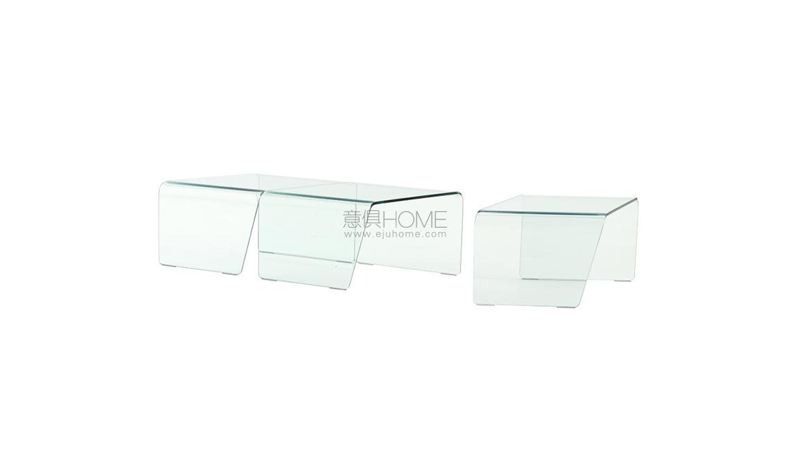 Set of 3 low tables in 10 mm thick clear curved glass. Each table is identical. The above- indicated dimensions are those of a single table. The overall dimensions of the 3 tables when arranged in 'circular' fashion is 31 x 88 x 78 cm.
