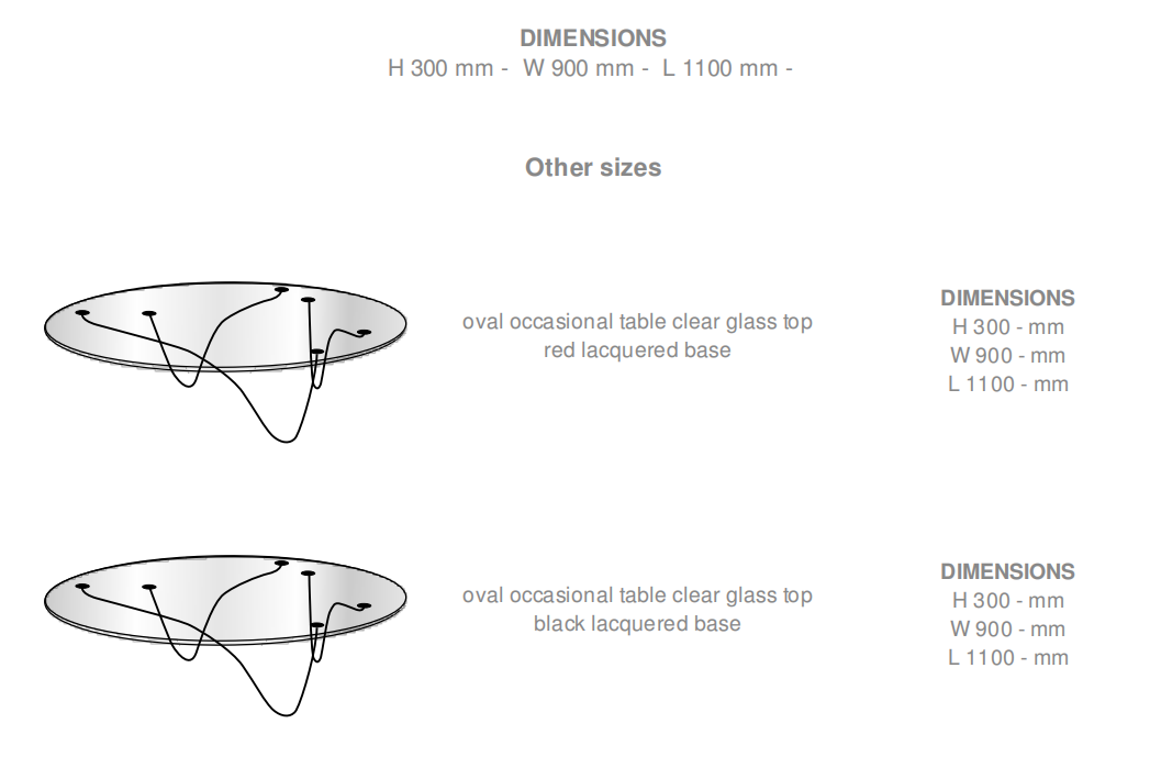 Top in 8 mm thick clear toughened glass. Matt lacquered circular steel base ? 15 mm. Plates (? 35 mm) to take the base are glued to the underside of the top.