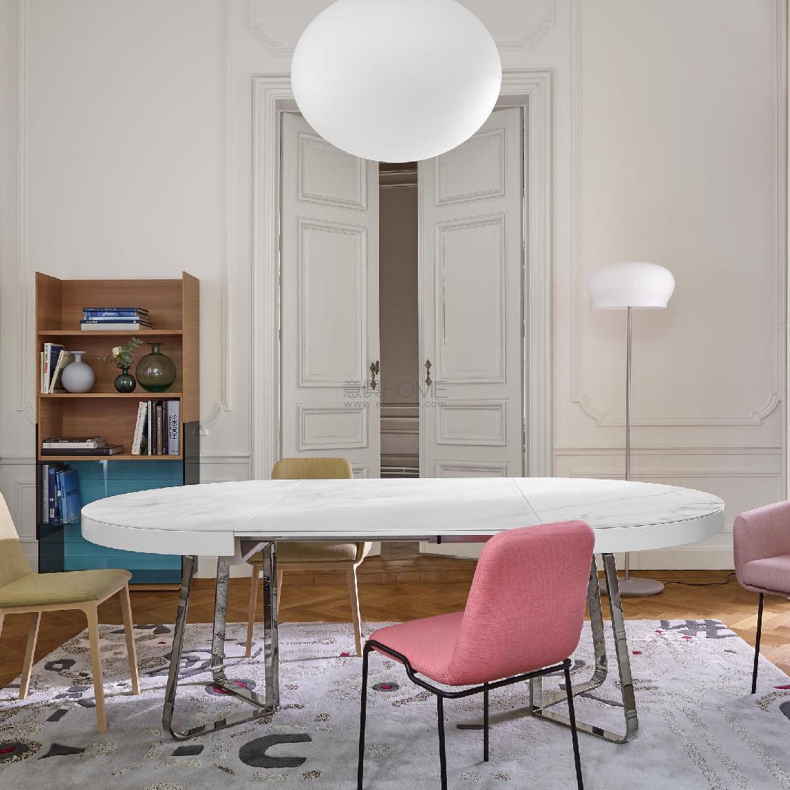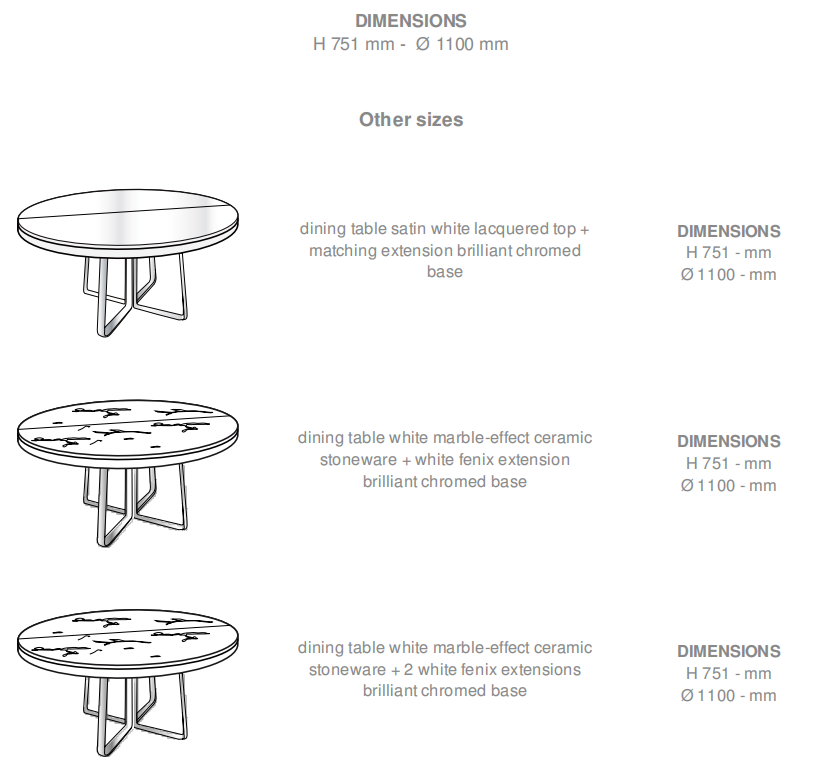 Dining table ? 110 cm : Dining table supplied with 1 or 2 extensions (W 55 cm), to be stored separately. Unlike the 2 tops, these extensions do not have a lip. The central base (in 50 mm x 10 mm section) is made from brilliant-chromed steel and is in two parts (attached to the tops) which move apart when one wants to install the extension(s). Where the tops are in ceramic stoneware, the extensions are in MDF clad in white Fenix whilst the edging is finished in white lacquer. This table accommodates 4 persons when closed, 6 with 1 extension in place and 8 with 2 extensions. Dining table ? 130 cm : Dining table with integral folding extension (W 87 cm). Unlike the 2 tops, this extension does not have a lip. The central base (in 50 mm x 10 mm section) is made from white lacquered, brilliant-chromed or black-chromed steel and is in two parts (attached to the tops) which move apart when one wants to unfold the extension. Where the tops are in satin white lacquer, argile lacquer, smoked oak-effect veneer or walnut, the extension is always matched to the tops. Where the tops are in white ceramic stoneware, the extension is either matched to the tops or in MDF clad in white Fenix. Where the tops are in white marble-effect ceramic stoneware, the extension is always in MDF clad in white Fenix. Where the tops are in metallic anthracite ceramic stoneware, the extension is either matched to the tops or in MDF clad in anthracite-stained ash veneer. This table accommodates 6 persons when closed, or 8-10 with the extension in place.