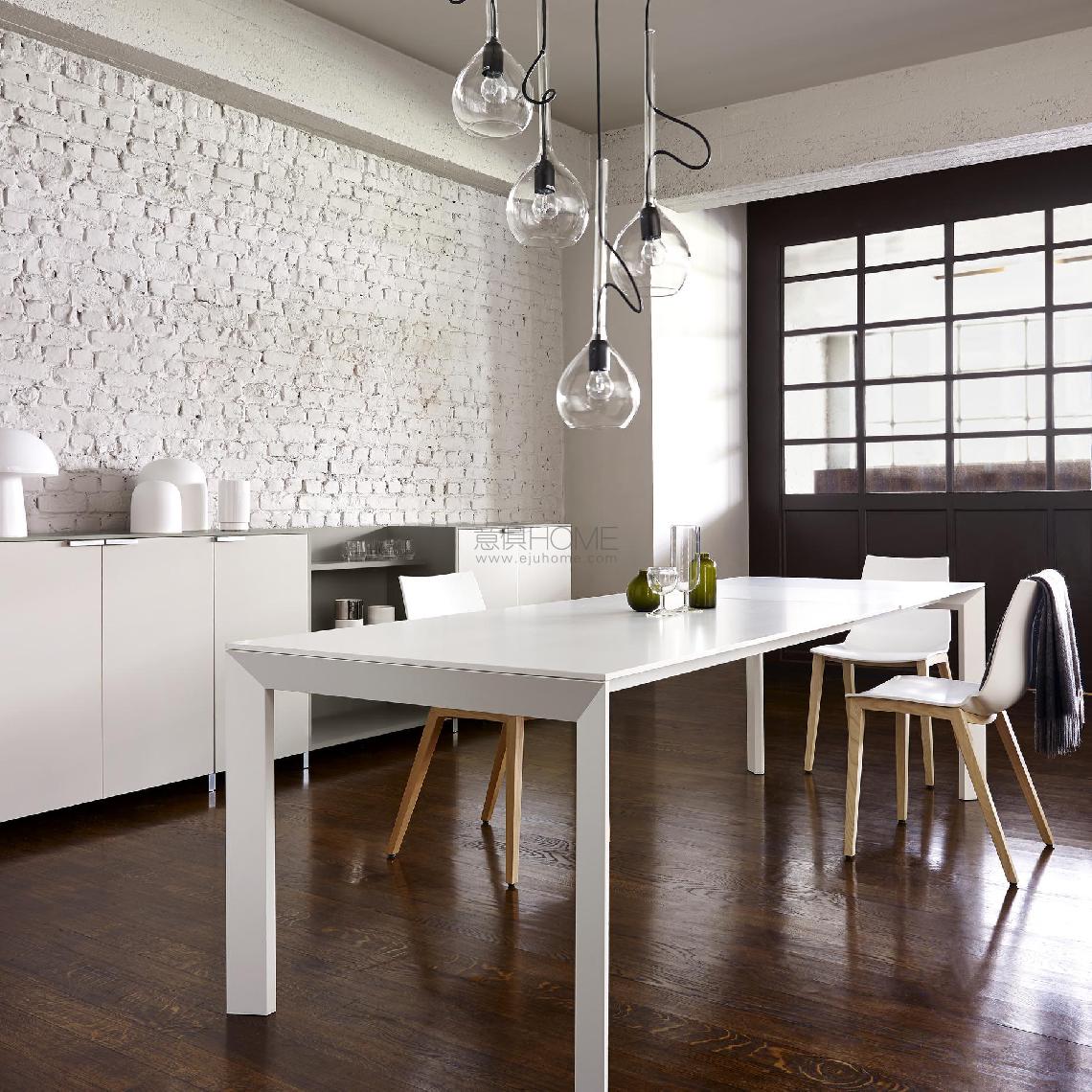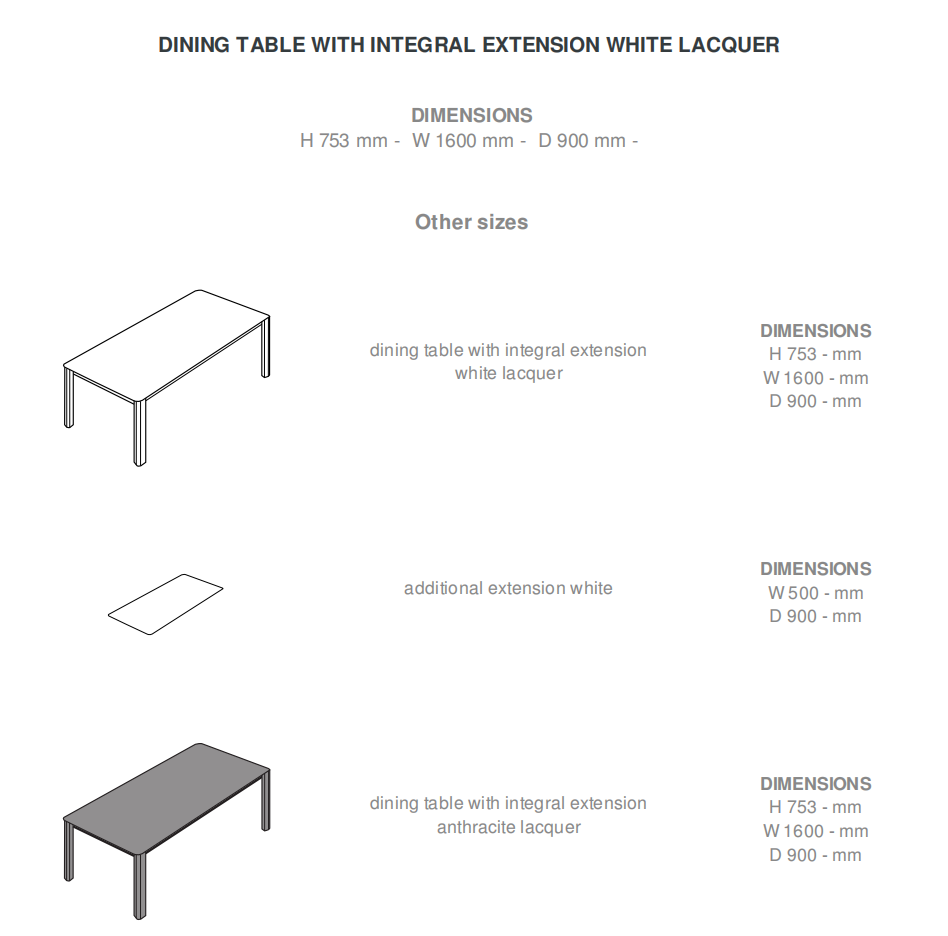 The uncluttered, contemporary lines of the FROST table make it just as suitable for use in a dining room as it is in a living room with open kitchen. Base in satin lacquered aluminium. Top and extension in laminated panels of particleboard, offering excellent resistance under intensive daily use. The 50 cm extension is stored beneath the top. The table is extended by moving the base, which is equipped with 2 nylon gliders and 2 castors. In open position, with 1 extension, the length of the table increases from 160 to 210 cm. A second extension, sold separately, may be added if desired.