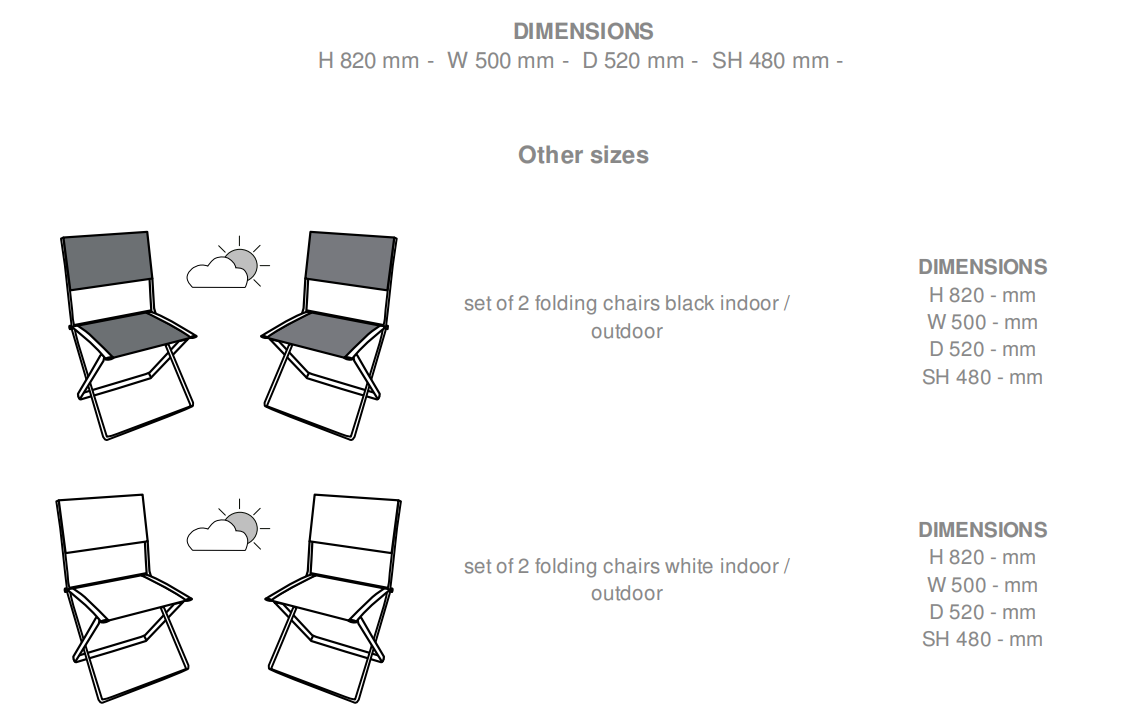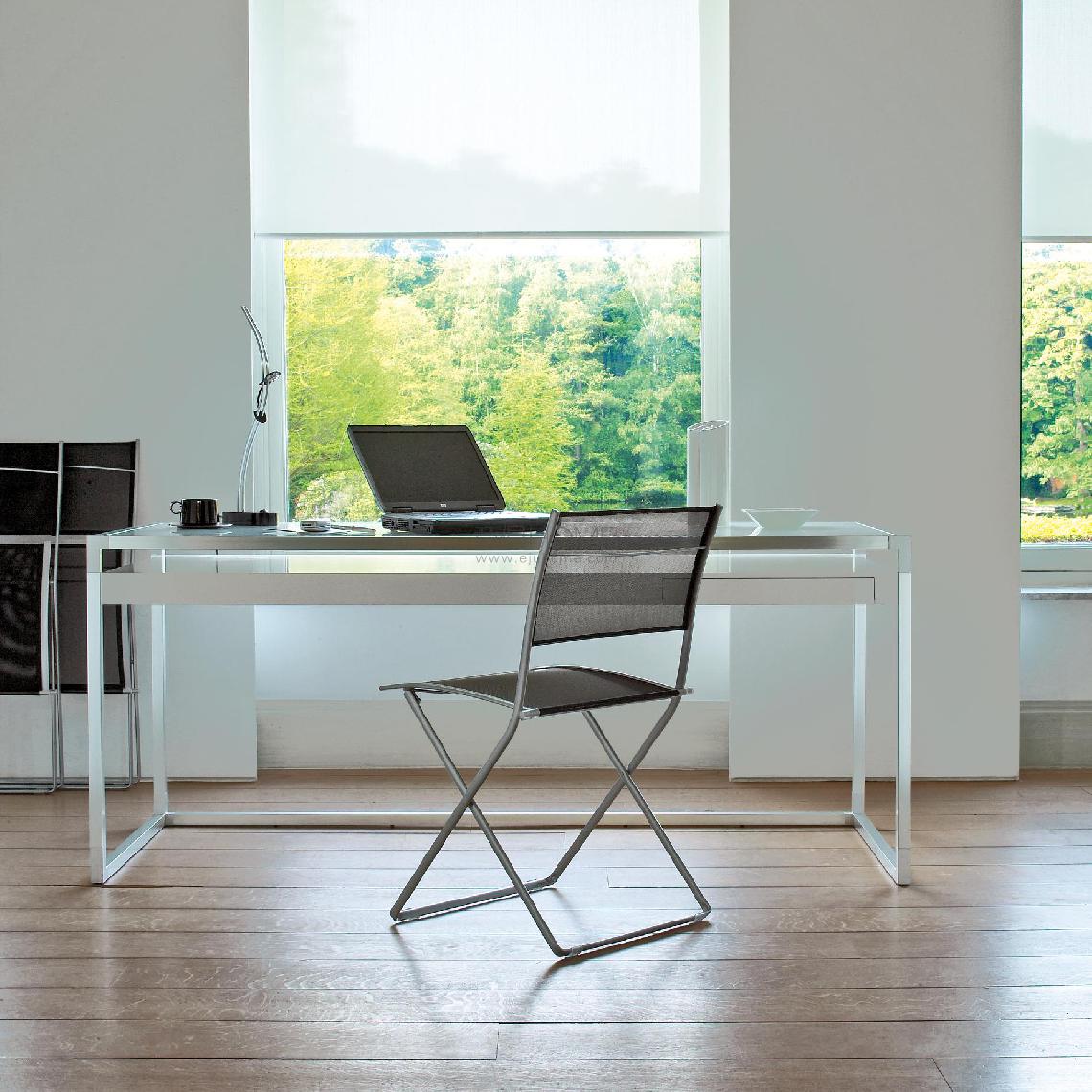 Folding chair with frame in steel, covered in Batyline - a material with a core of composite fibres which is woven, heat-bonded and coated in plastified PVC. PLI is very light, can be easily transported flat, and is comfortable (thanks to the Batyline on its seat and back).
