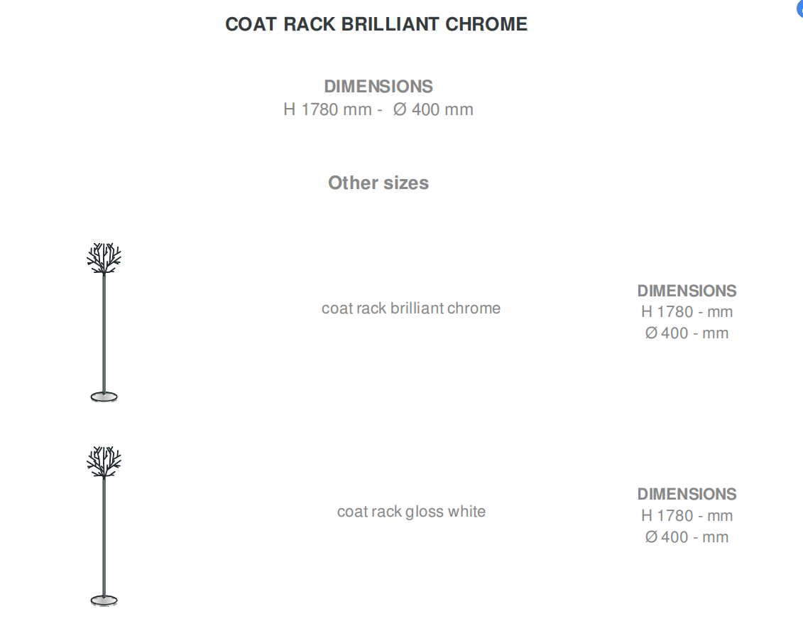Coat rack in Epoxy black lacquered steel. Coat rack in brilliant chromed steel. Coat rack in Epoxy gloss white lacquered steel. Coat rack in transparent varnished copper- plated steel.
