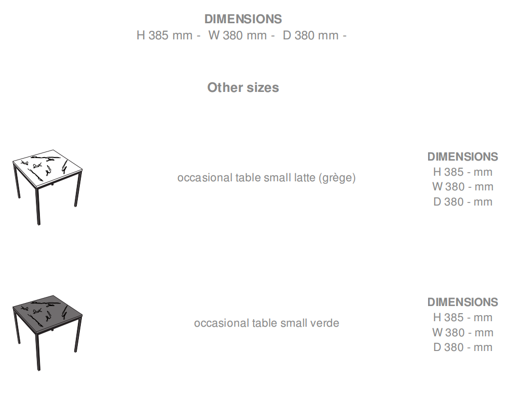 Top (38 x 38 x thickness 2 cm or 45 x 45 x thickness 2cm) in LATTE (brecha maritima) or in VERDE (Indian Green) or in CORSé (Marron emperador) coloured marble, brilliant-polished with stain-resistant treatment. Structure in satin black lacquered steel with black gliders.
