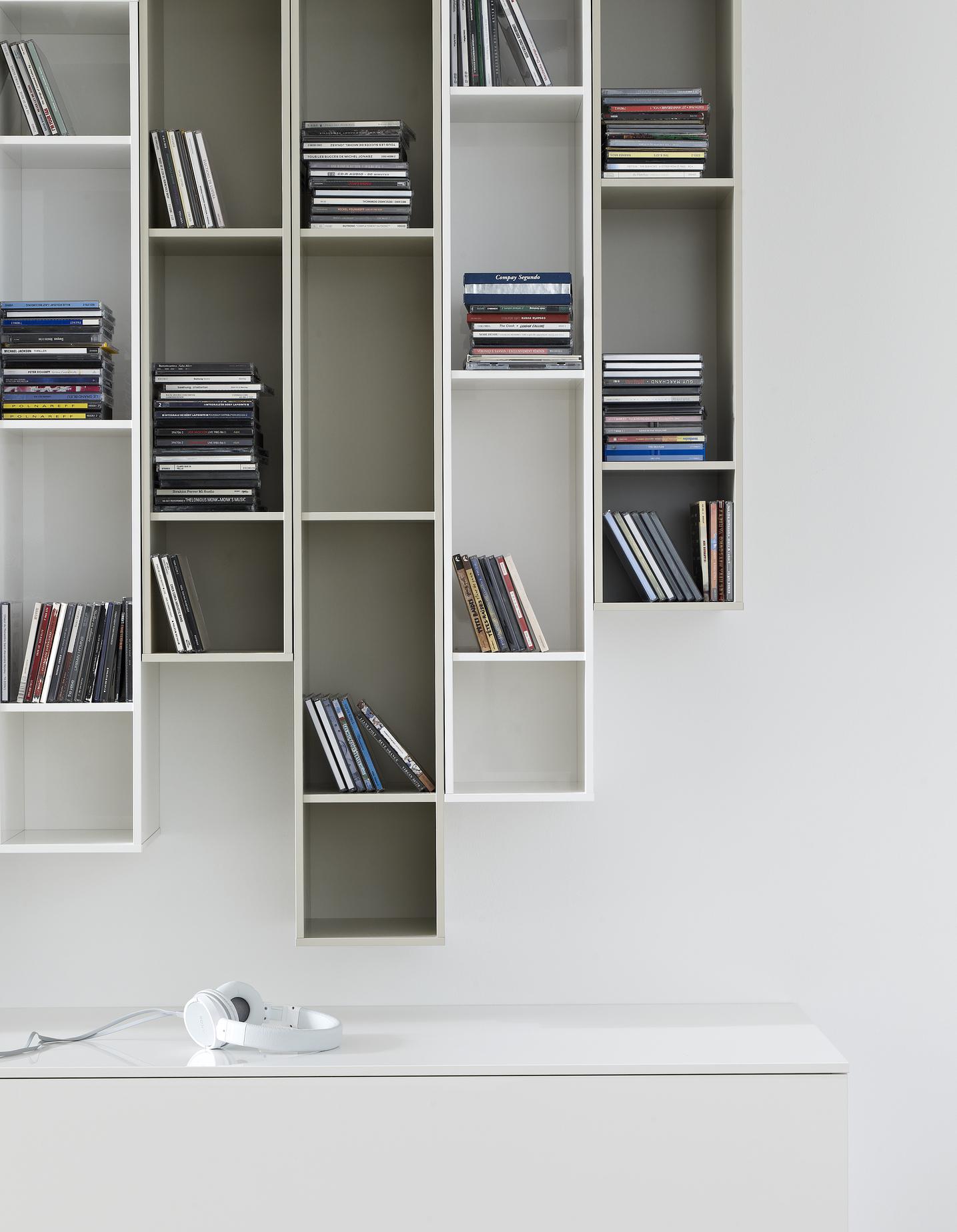 THE CONCEPT : Launched in 2009 and comprehensively augmented in 2016 and 2017 in terms of both functionality and variety of finishes, Book&Look now offers a number of innovations for 2019 which increase both its real and perceived quality and will further expand its possibilities. These innovations encompass the opening system for the doors, the addition of a niche in chests (living room items and sideboards), a new shelving unit, and more generally a significant expansion of the choice of finishes. QUALITY OF MANUFACTURE & FINISHES : NEW ‘PUSH’ DOOR OPENING SYSTEM : The current ‘push’ system has been replaced with a new ‘push’ system of the same kind used for the Et Cetera range: a box with a magnetized pin located on the chest and a galvanized plate set into the door. This system will present less play over time, along with a more reliable method of adjustment (one tightens or loosens the pin). The new ‘push’ system works easily and cleanly : the door retains its central silicone pad, which offers gentle, quiet control when closing. The ‘push’ mechanism is light grey (for the white, argile or perle lacquer and ‘pack’ colour finishes) or black (for the plomb finish), to fall in line with standard colourways (and with the darker ‘pack’ colours). NICHES: To enliven the fronts of the living room items and sideboards, a decorative, functional arrangement for the niches is proposed. These new niches may be located in chests designed to have 2, 3, 4 or 6 doors (all the possible positions can be seen on the following price pages). The interior of the niche remains in the same colour as that of the chest. Niches are equipped using the 5 following elements : A 12 mm thick 20 mm aluminium frame located at the front of the niche to emphasise its contours. This may be finished in the 5 standard colours and the 12 ‘special’ colours. It is thus possible to specify the frame in the same colour as the chest, or to choose another toning or even contrasting colour. This frame is set at 2 mm from the structure to extend the shadow gap of the doors and render the side view of the unit more regular. The back panel of the niche, which remains visible, is lacquered as per the structure of the chest. It is also possible, as an option, to add a 2 mm back panel finished in one of the 16 ‘special’ lacquer colours on offer. As an option, it is also possible to add an illuminated back panel. Available in one of the 17 ‘special’ lacquer colours, it offers indirect lighting via 4 hidden 3 mm LED strips along its edges. This illuminated back panel is set at 12 mm from the actual back panel of the unit to optimise the halo effect of neutral white light (4000K) from the base of the niche. The 20 W transformer supplied will feed one or two illuminated back panels (7.2 W each). A glass shelf in 8 mm thick ‘cristal’ glass may also be added to the niche. A 3 mm thick aluminium shelf of remarkable slimness and elegance, finished in one of the 17 ‘special’ lacquer colours, is also available. B5 SINGLE BOOKSHELF: this is 2/3 of the width of the C3 bookshelf. DEVELOPMENTS IN TERMS OF FINISHES: To give almost total freedom in terms of finish across the range, the following extensions have been put in place. All structures may now be finished in plomb lacquer as standard. This enables the price to be kept down. The 17 ‘special’ colours may now be used on all shelving units (previously, only the C3 shelving unit offered that possibility), all chests (previously only available with the 105 x 105 and 52.5 x 100 chests), and all podium chests (matching interior). The walnut veneered door with fern-effect motif has been replaced by a door in our new natural varnished walnut, which is warmer and more vibrant, with a vertical grain.