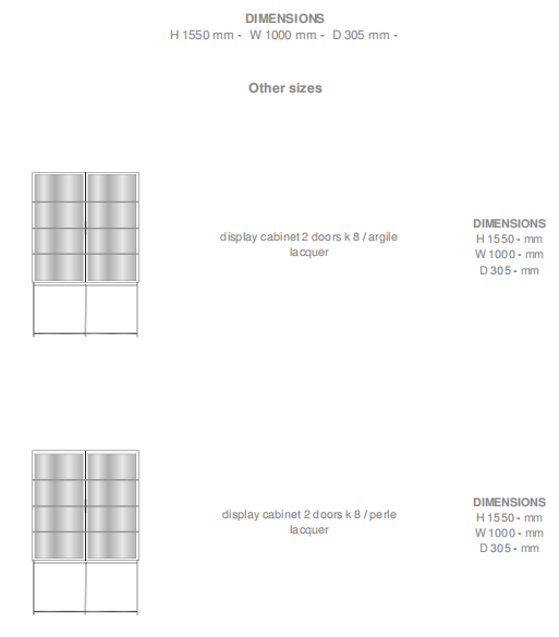 THE CONCEPT: This ensemble of display units could resemble a geometric spatial occupation challenge between the body of the chest which is at once solid and diaphanous, and the thin mesh which streamlines the perimeter of its flat surfaces and is seen as an extension of the carcase. A provocative note somewhere between the essential industrial Bauhaus elements and contemporary elegance is struck through metallic finishes. The colours, reflected evanescently by the striped glazed panels, fade progressively to the point of disappearance, producing optical abstractions. An impression of segmented, repetitively rhythmed geometric figures, emphasised by the lacquered surfaces and wood panels to the rear, appears poetically, like a curtain which discreetly heralds the interior. TECHNICAL DESCRIPTION: The CANALETTO collection of glazed units is a small but very singular range. The upper section is completely glazed, both front and sides, with a ridged glass with a widely-spaced linear pattern, an alternation of dips like peaks and troughs. This slim glass lets one see, or least guess at, the outlines of the objects held within, as the light plays across it. The glass of the doors is mounted flush with the smoked, brushed anodised aluminium frames, held in place by invisible glue beneath a bronze martingale. The lower shelves are in metal and are slim, lacquered and entirely rear-mounted, being attached to the back panels. The back panels are arranged between the shelves. They are either in dark walnut veneer, or lacquered. In such pieces as these, lighting considerably enriches their appearance and shows to best effect the outlines of objects behind the doors and sides. This lighting takes two forms : In the display unit there are 4 horizontal illuminated strips set into the 4 back panels, with a smoked diffuser which does not allow glare and which is attractive even when unlit. The version with remote control and dimmer enables the light intensity to be reduced if desired. In the sideboard and high 2-door chest, indirect lighting comes from the rear of the vertical side panels, with an illuminated strip located on the rear edges of the panels ; it illuminates both sides and creates a beautiful halo of light inside the unit. The colour of the shelves and back panels adds to the lighting ambiance and can also be modulated via the dimmer. The base is in steel, with 12mm roundels mounted like an array of bamboo for solidity and lightness; it contrasts with the top. It is finished in bronze lacquer to co-ordinate with the aluminium door frames. The legs have height- adjustable jacks for levelling purposes. Its height is 250 or 500 mm, depending on the unit.